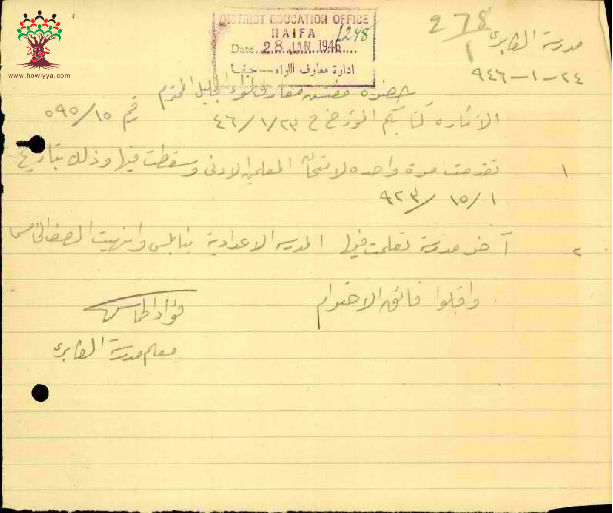 رسالة من المعلم فؤاد خماش الى مفتش المعارف بخصوص تقديمه لامتحان المعلمين الأدنى