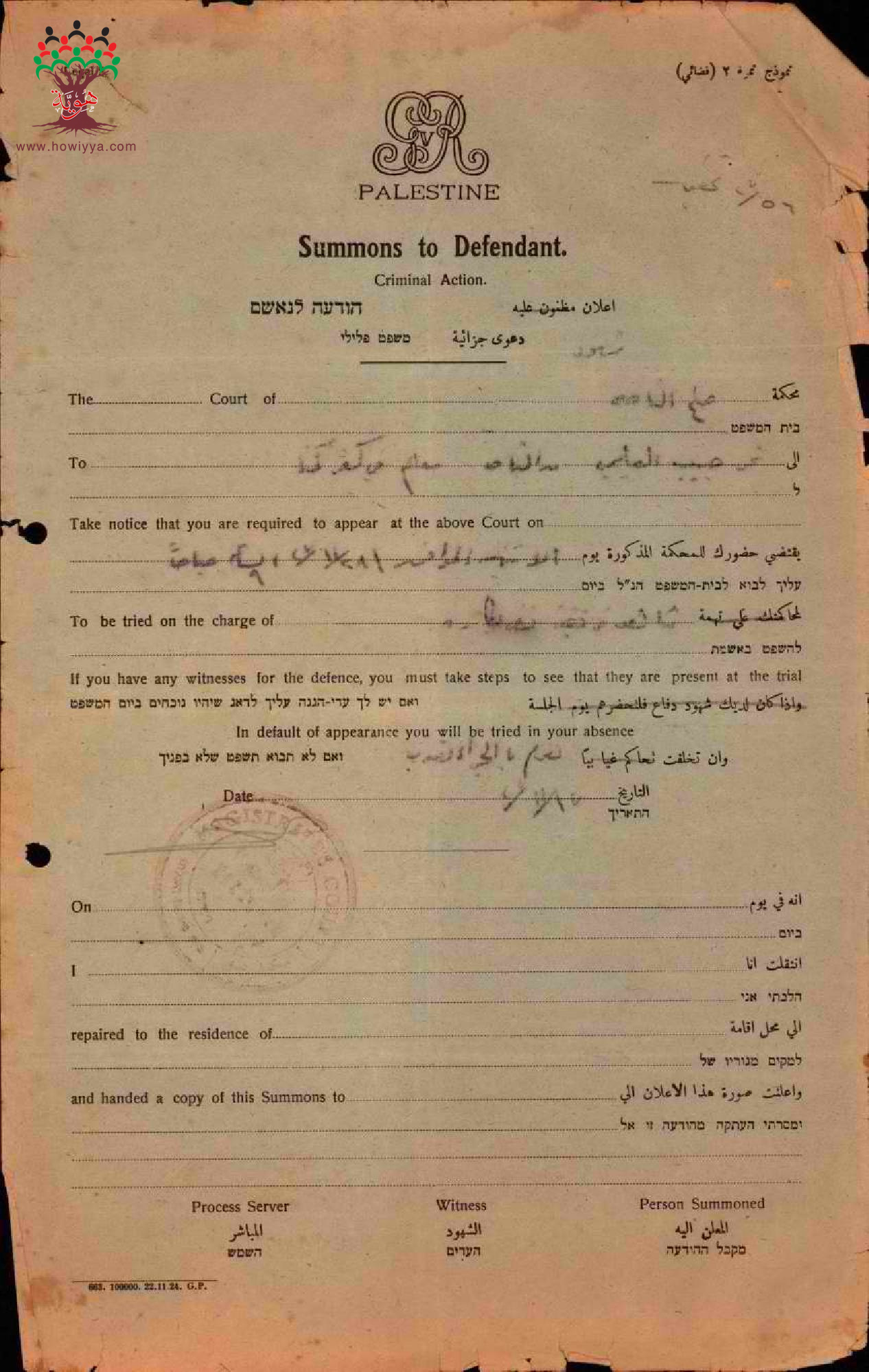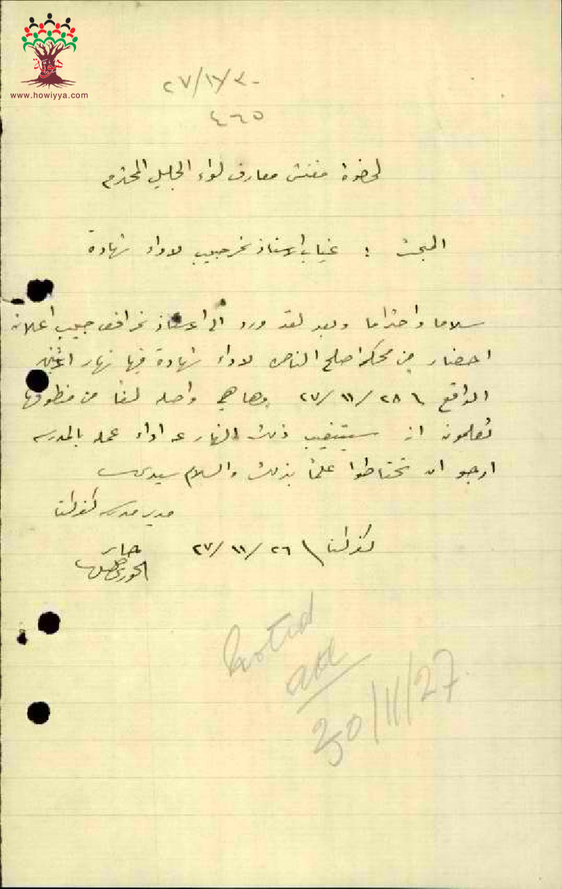 رسالة من مدير مدرسة كفر كنا الى مفتش المعارف بخصوص اجازة للمعلم نمر العليمي لأداء شهادة في المحكمة مرفقة باعلان شهود المحكمة