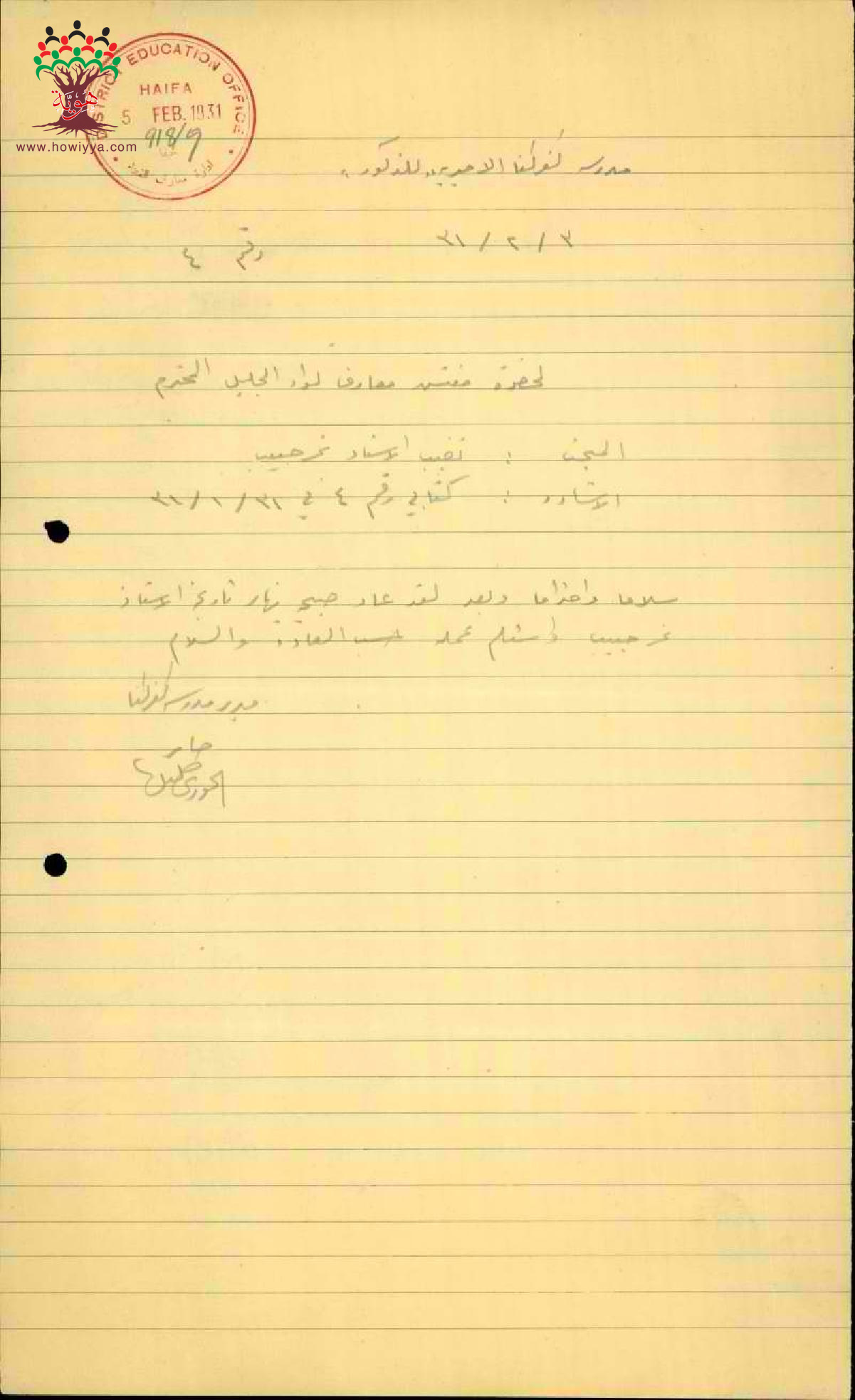 رسالة من مدير مدرسة كفر كنا الى مفتش المعارف بخصوص عودة المعلم نمر العليمي الى العمل