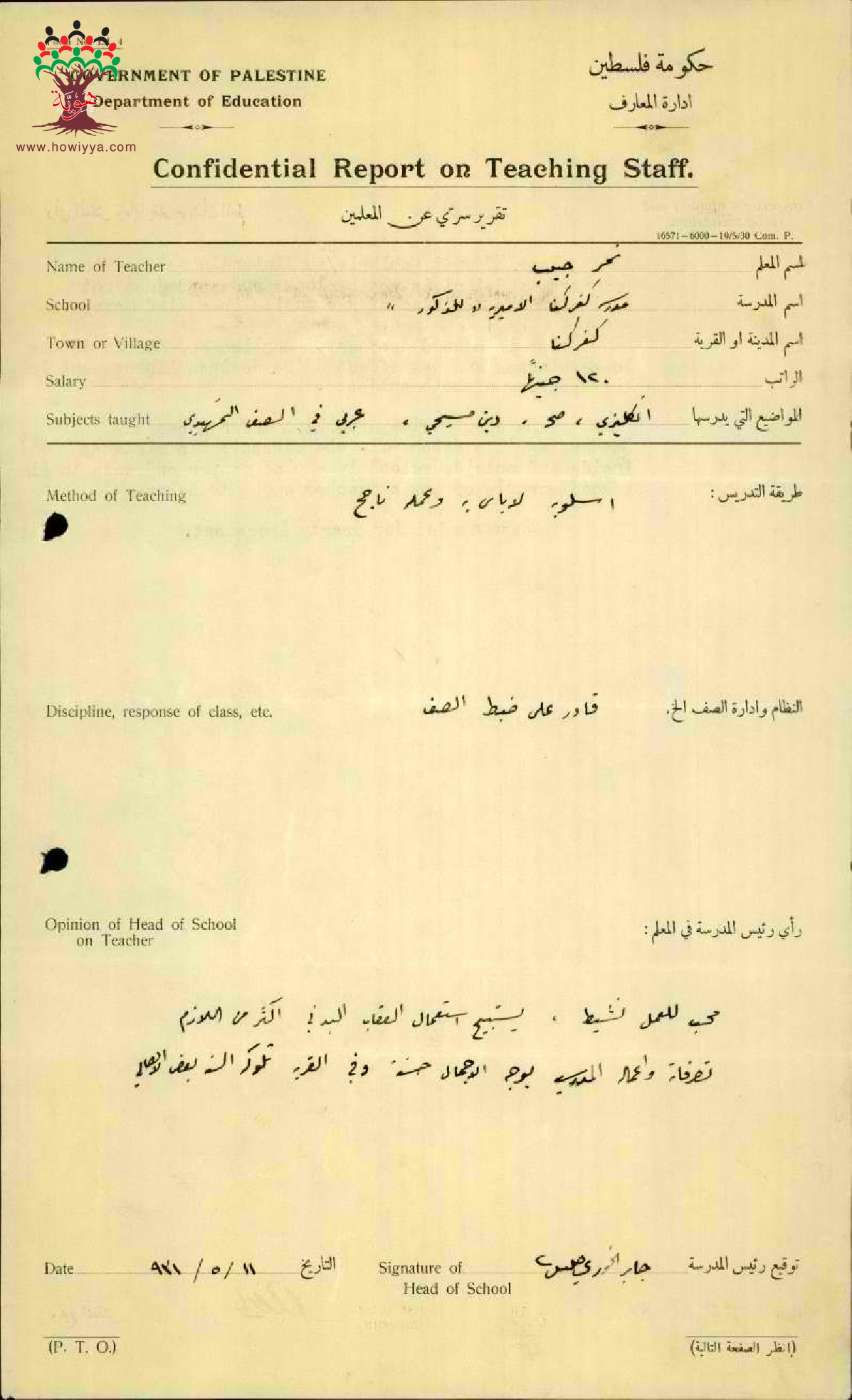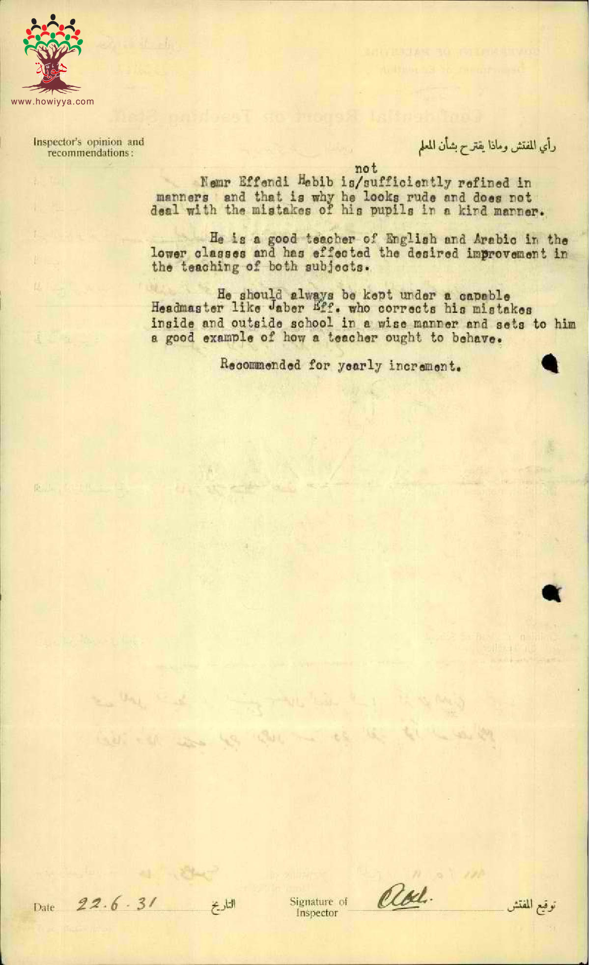 تقرير تفصيلي عن أداء المعلم نمر حبيب العليمي في مدرسة كفر كنا سنة 1931