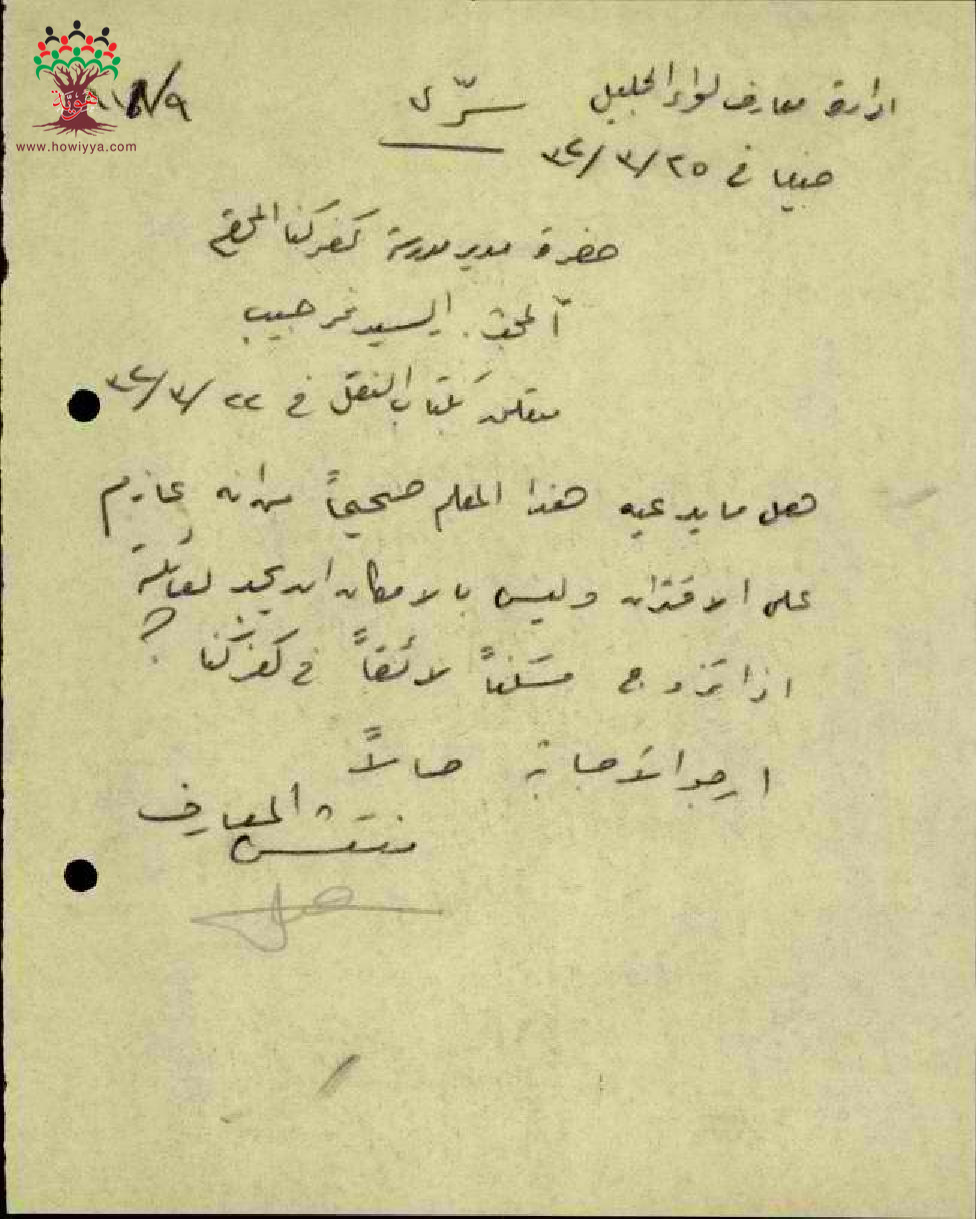 رسالة من مفتش المعارف الى مدير مدرسة كفر كنا يسأله عن صحة اعتزام المعلم نمر العليمي على الاقتران وبالتالي طلبه للنقل الى الناصرة