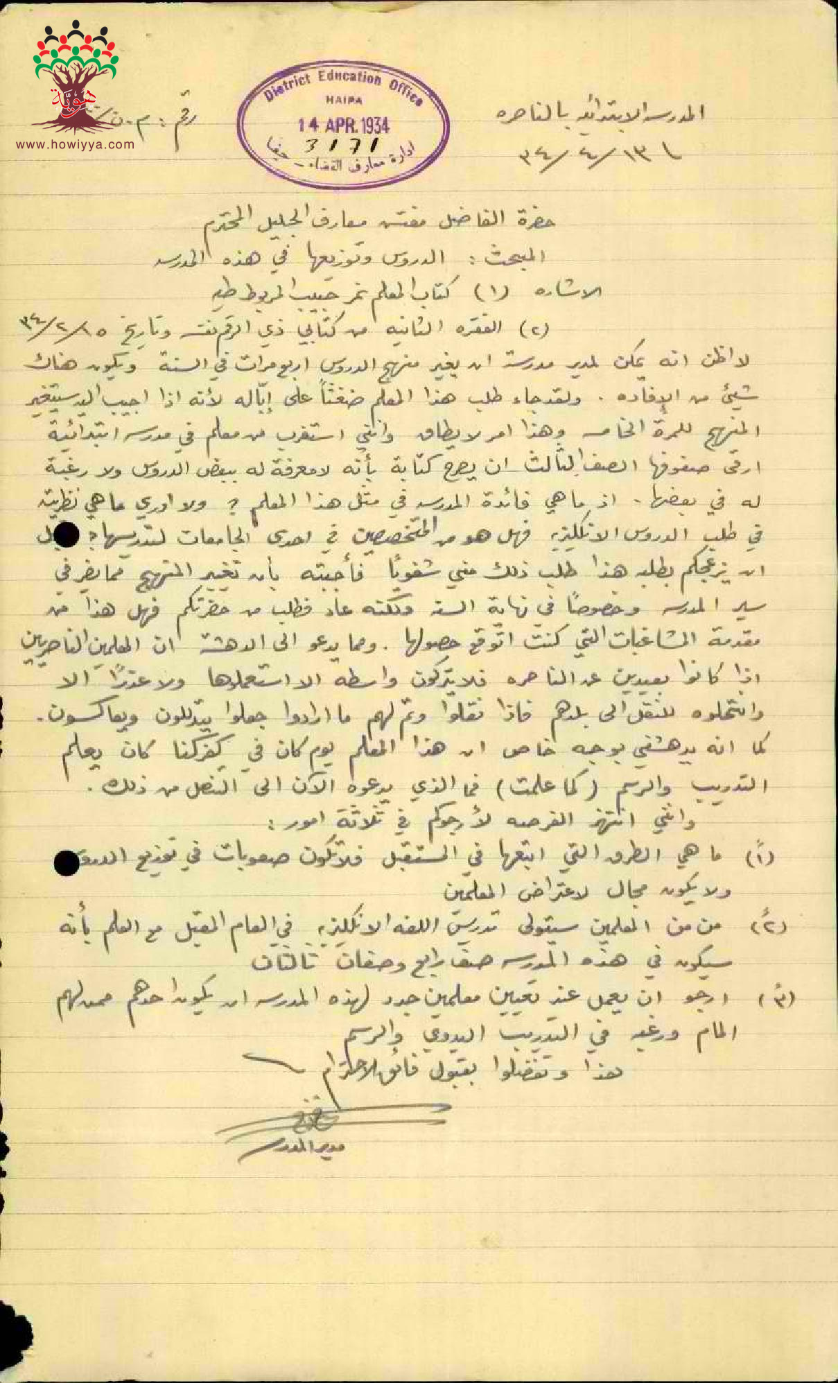 رسالة من مدير مدرسة الناصرة الى مفتش المعارف بخصوص توزيع الدروس بعد عودة المعلم نمر العليمي الى العمل
