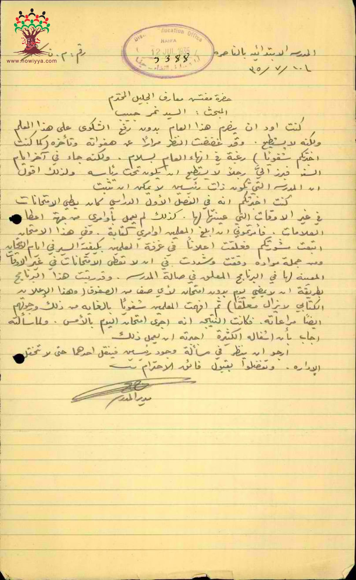رسالة من مدير مدرسة الناصرة الىى مفتش المعارف يرفع فيها شكوى ضد المعلم نمر العليمي