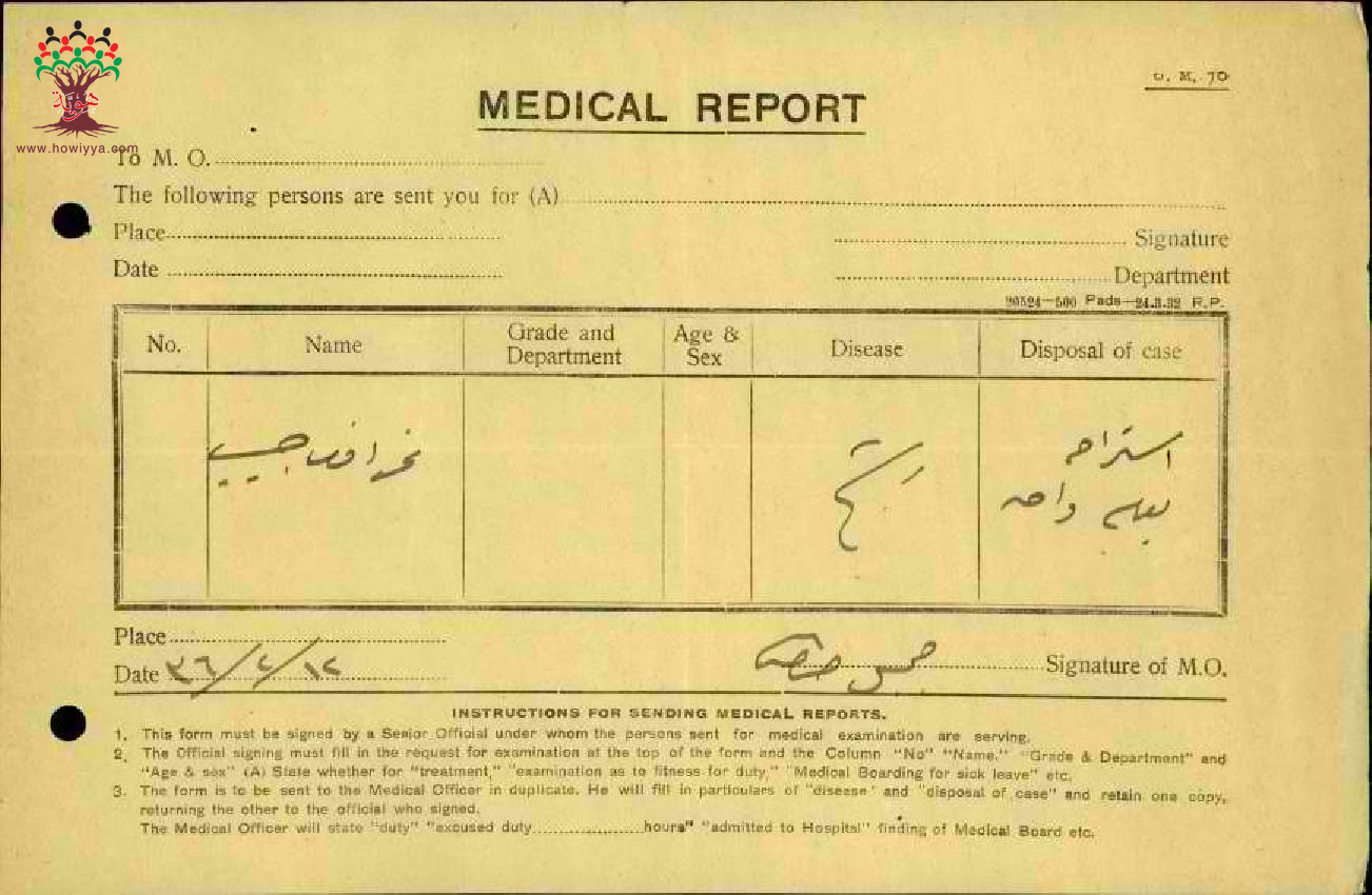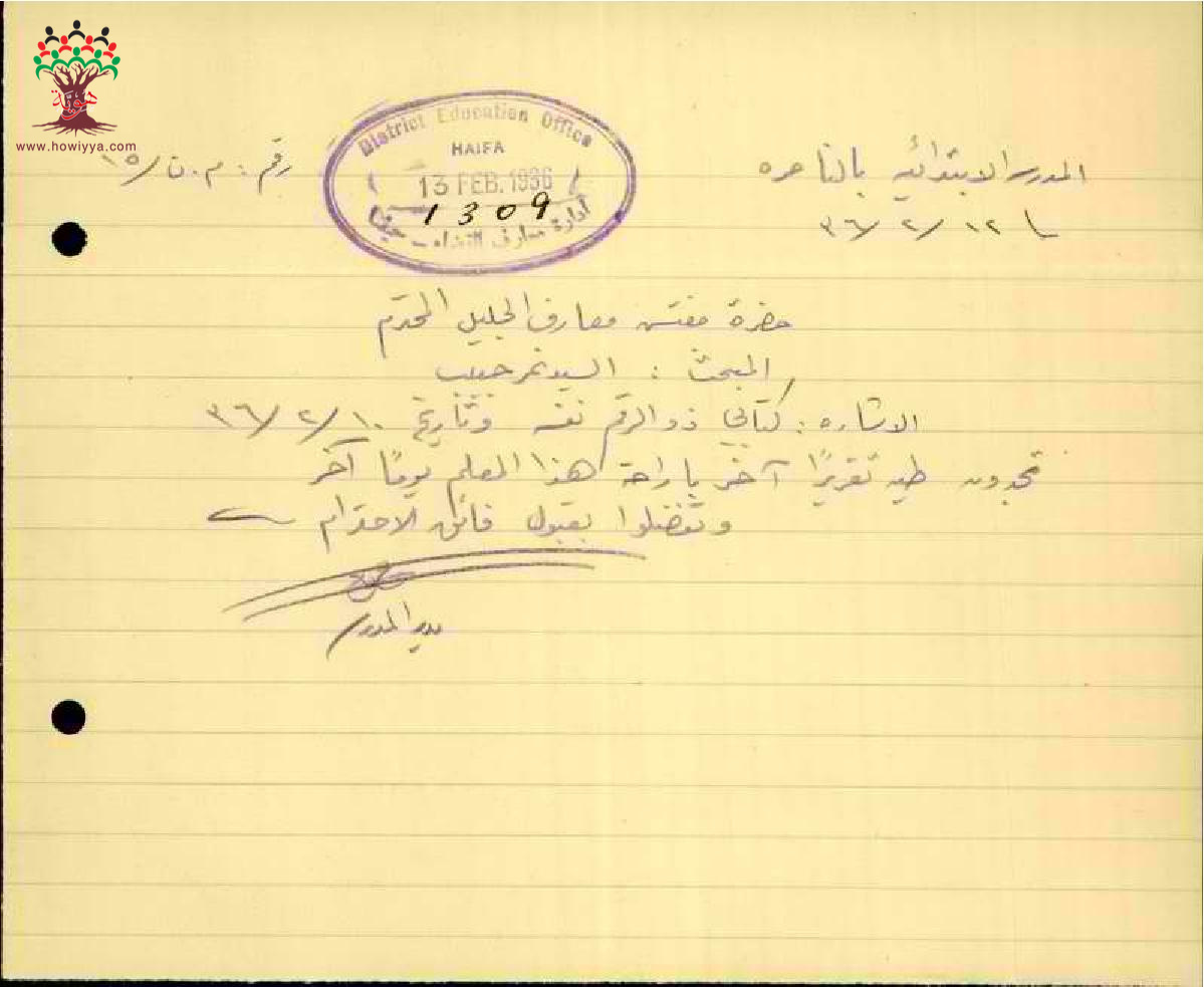 رسالة من مدير مدرسة الناصرة الى مفتش المعارف بخصوص تغيب المعلم نمر العليمي مرفقة بالتقرير الطبي