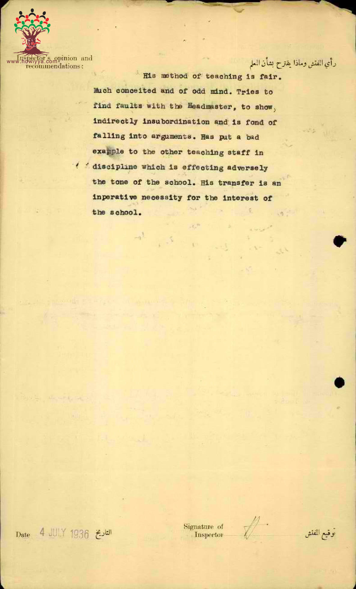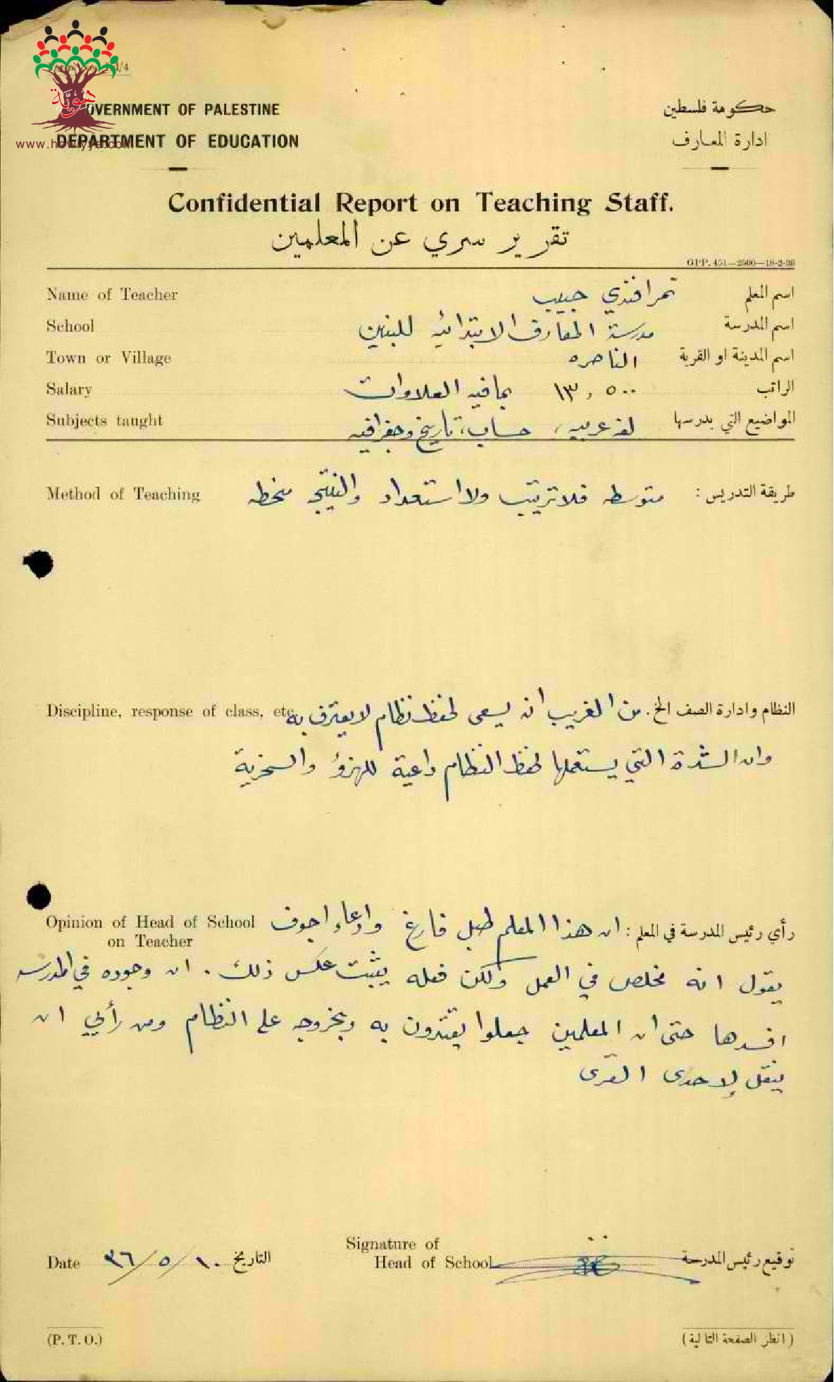 تقرير تفصيلي عن أداء المعلم نمر حبيب العليمي في مدرسة الناصرة سنة 1936