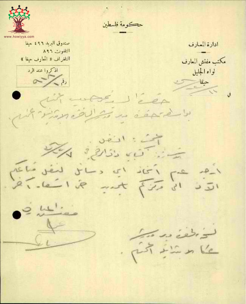 رسالة من مفتش المعارف الى المعلم نمر العليمي بخصوص عدم نقل متاعه حتى اشعار آخر