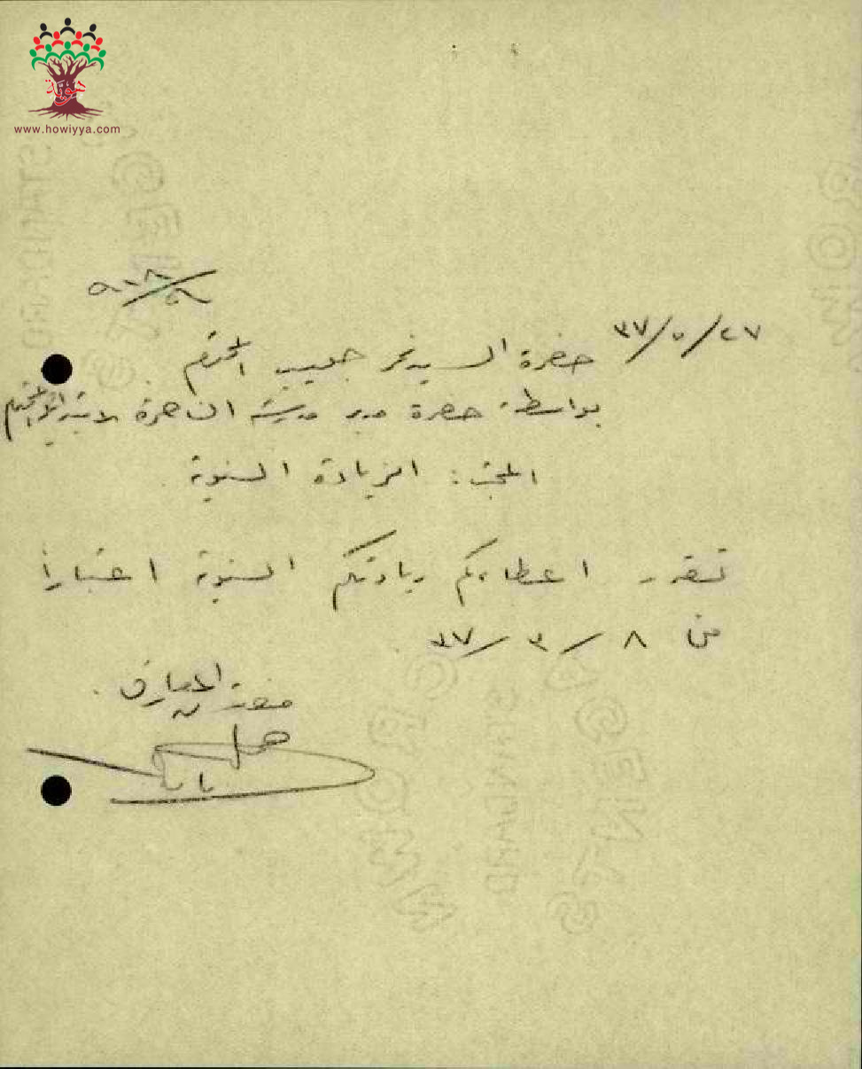 رسالة من مفتش المعارف الى المعلم نمر العليمي بخصوص اعادة زيادة راتبه السنوية