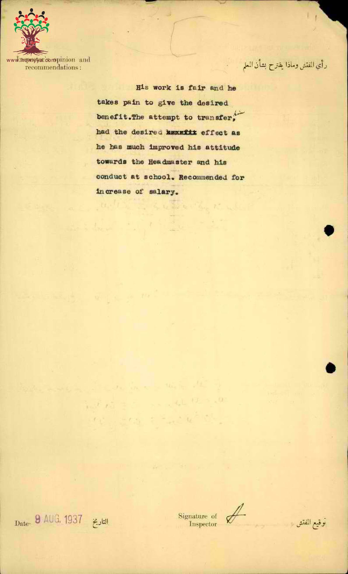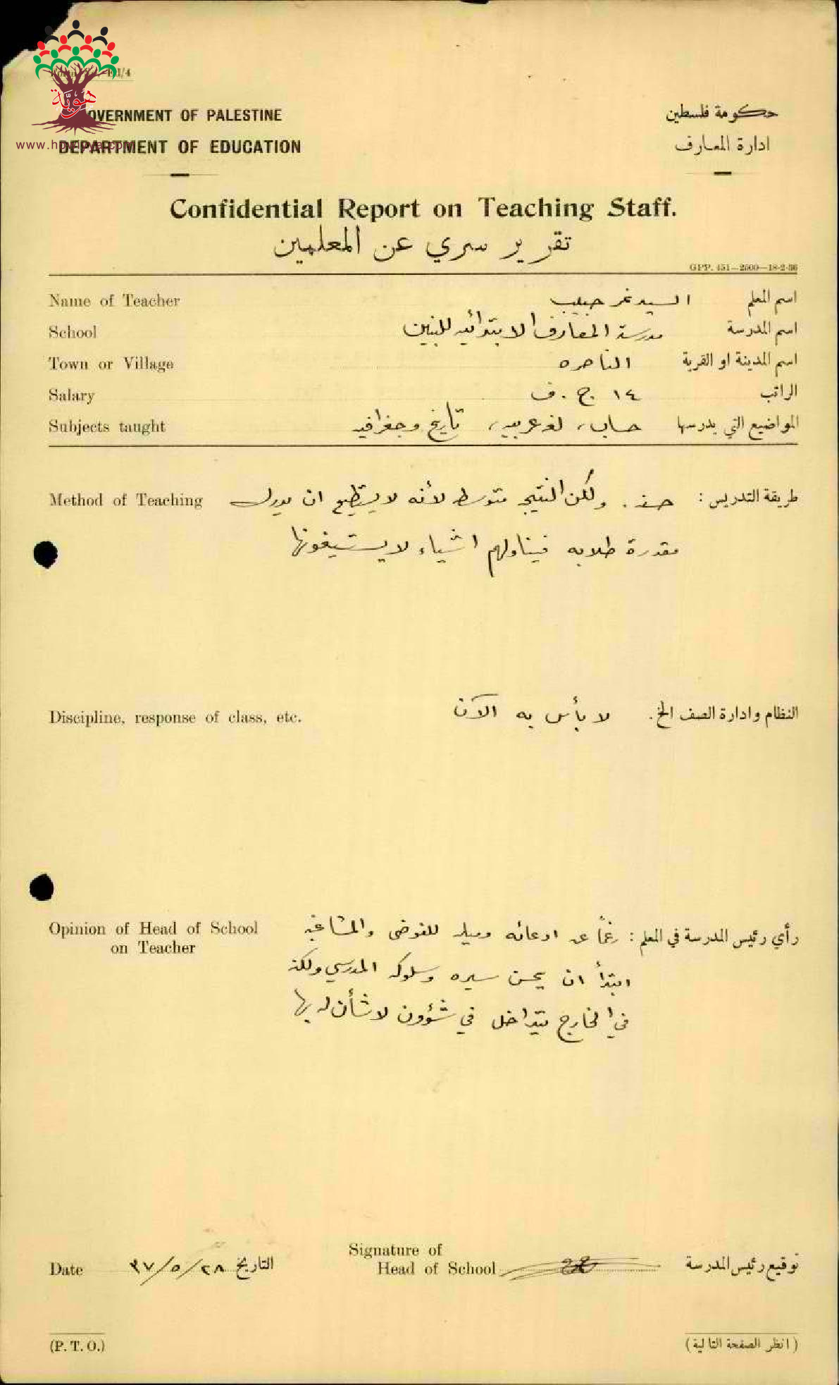 تقرير تفصيلي عن أداء المعلم نمر حبيب العليمي في مدرسة الناصرة سنة 1937