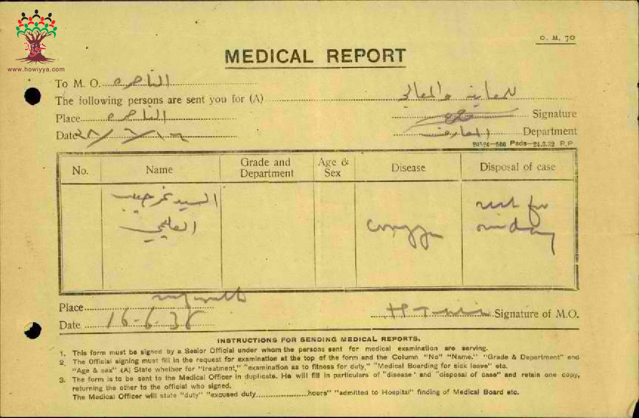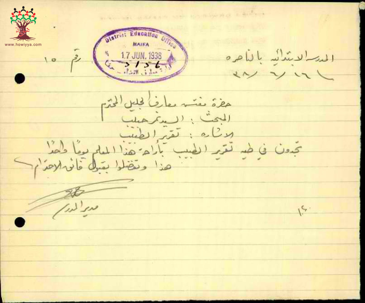 رسالة من مدير مدرسة الناصرة الى مفتش المعارف بخصوص تغيب المعلم نمر العليمي مرفقة بالتقرير الطبي