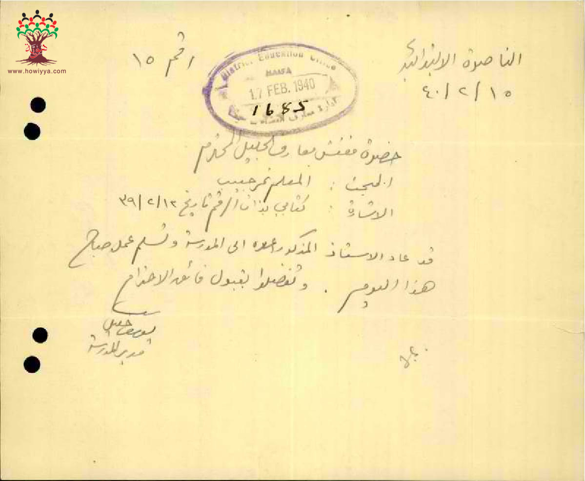 رسالة من مدير مدرسة الناصرة الى مفتش المعارف بخصوص عودة المعلم نمر العليمي الى العمل
