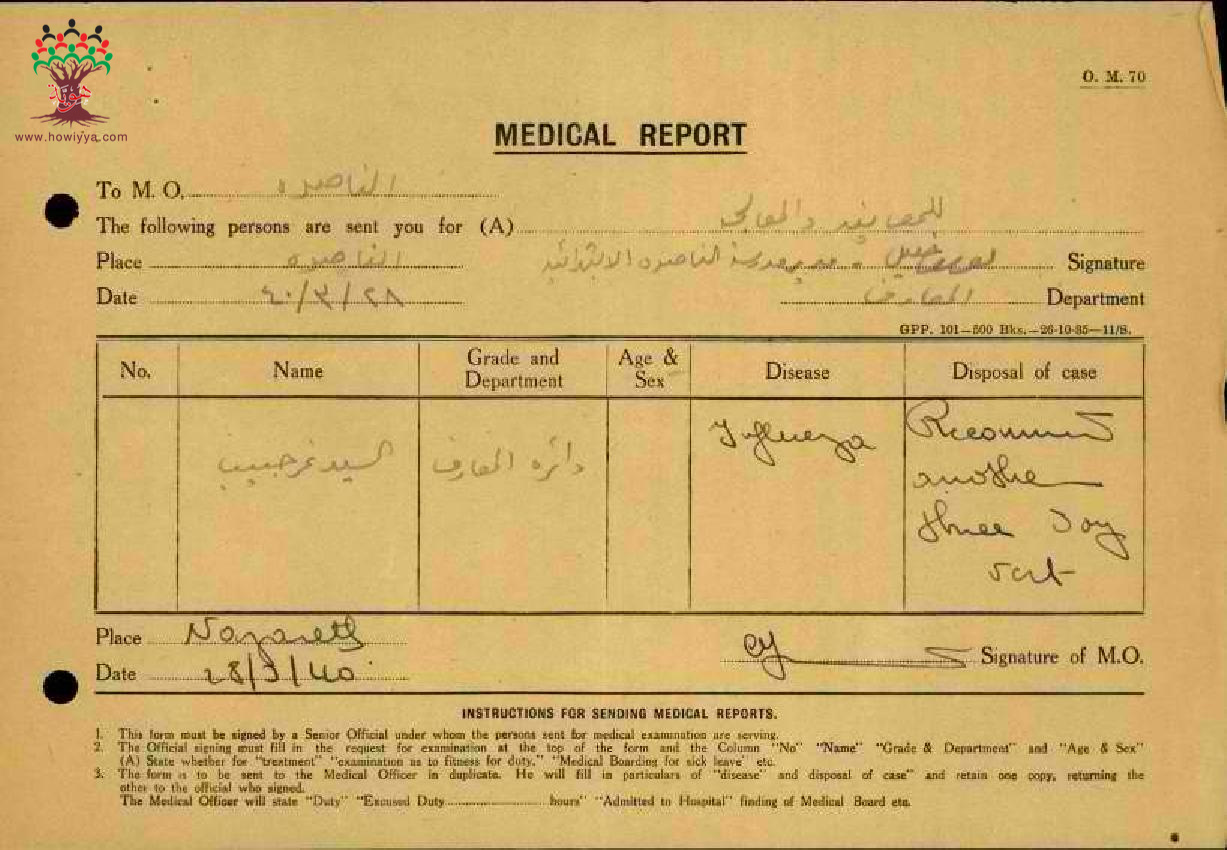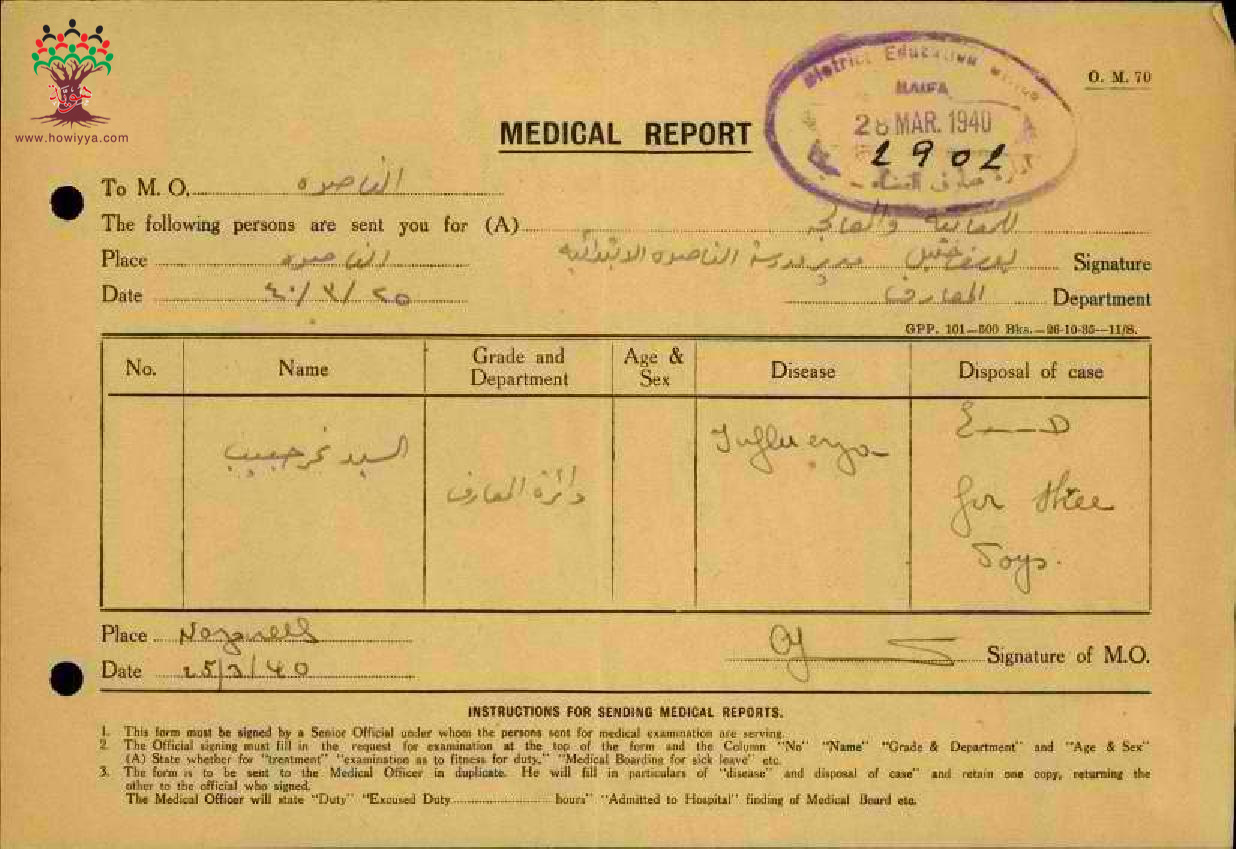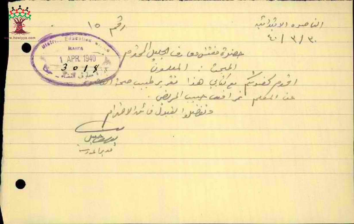 رسالة من مدير مدرسة الناصرة الى مفتش المعارف مرفقة بالتقارير الطبية لتغيب المعلم نمر العليمي