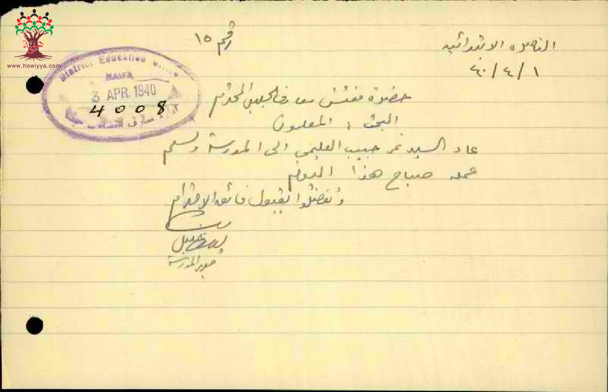رسالة من مدير مدرسة الناصرة الى مفتش المعارف بخصوص عودة المعلم نمر العليمي الى العمل