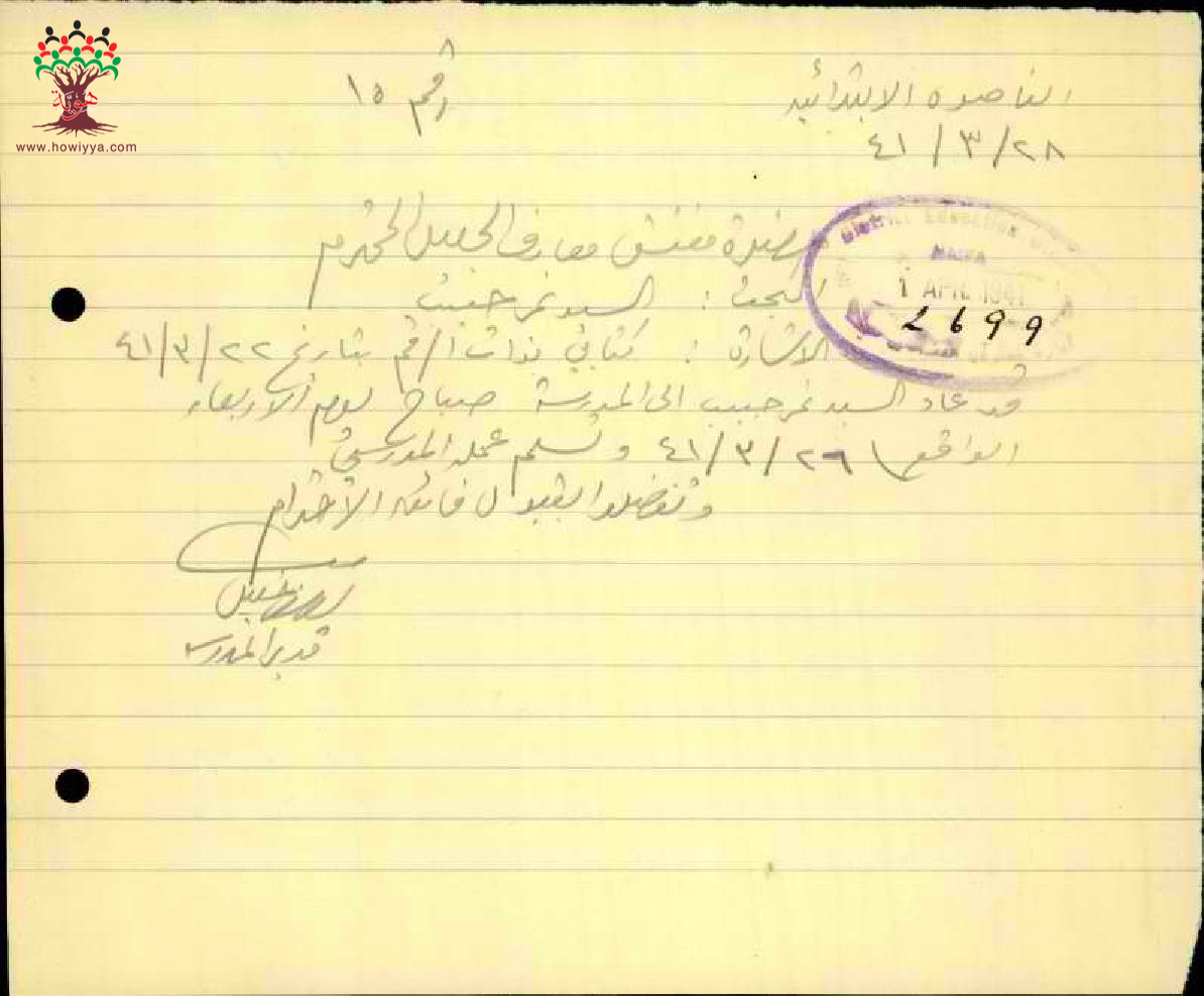رسالة من مدير مدرسة الناصرة الى مفتش المعارف بخصوص عودة المعلم نمر العليمي الى العمل