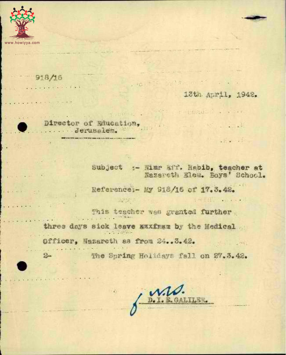 رسالة من مفتش المعارف الى مدير المعارف بخصوص تغيب المعلم نمر العليمي ويلي ذلك عطلة الربيع