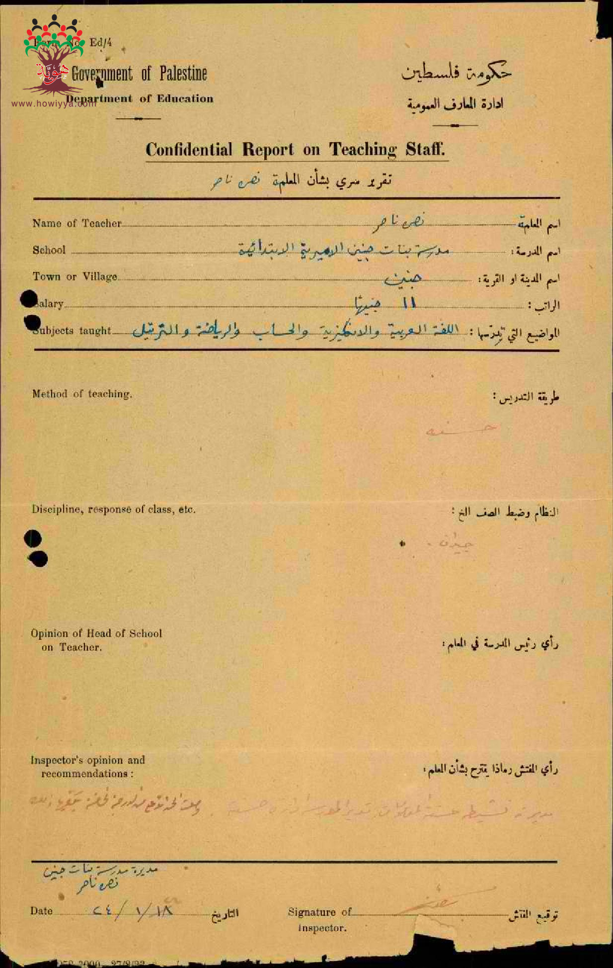 تقرير تفصيلي عن أداء المعلمة نصرة ناصر في مدرسة جنين للإناث سنة 1923