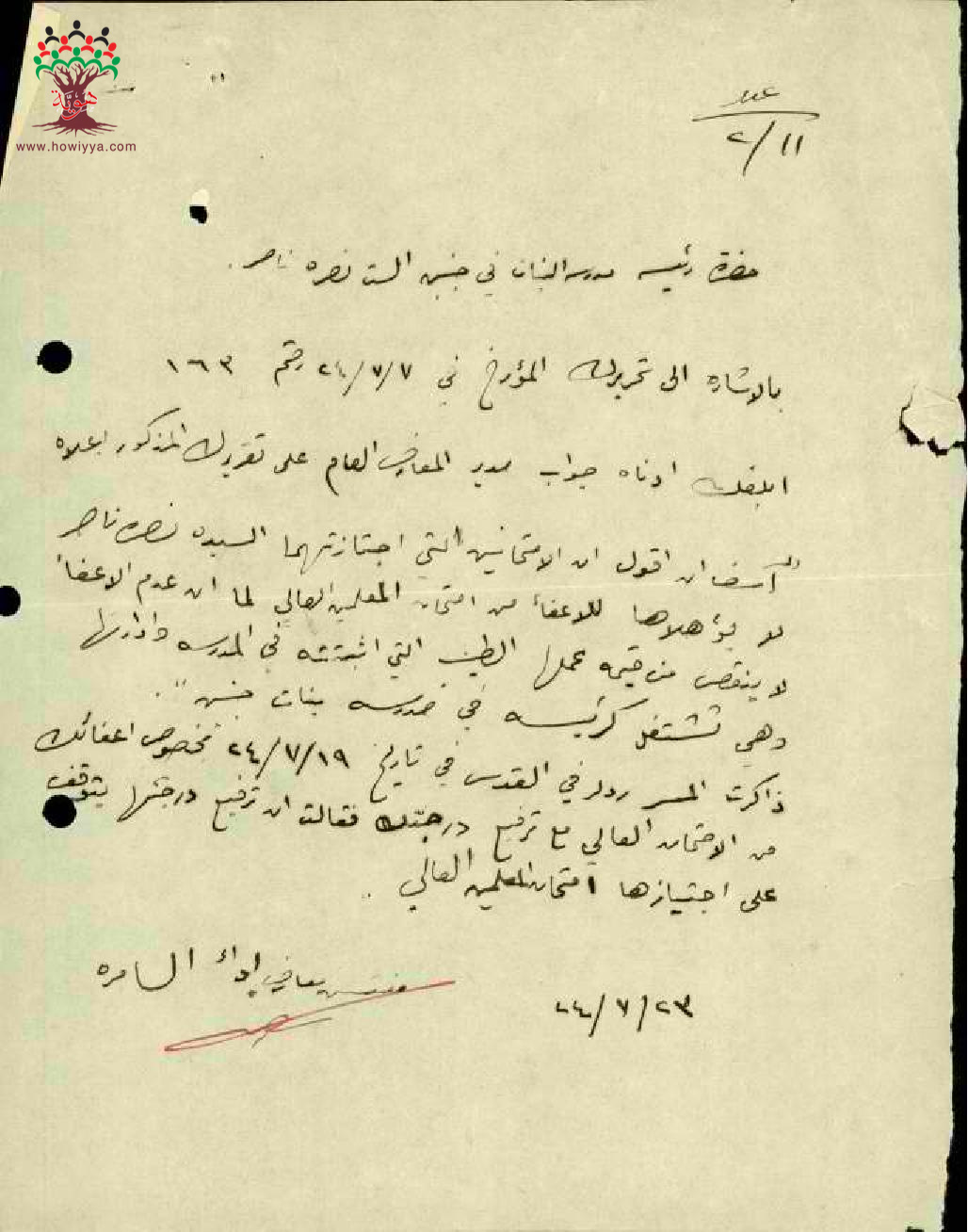 رسالة من مفتش المعارف الى المعلمة نصرة ناصر بخصوص عدم اعفائها من امتحان المعلمين العالي