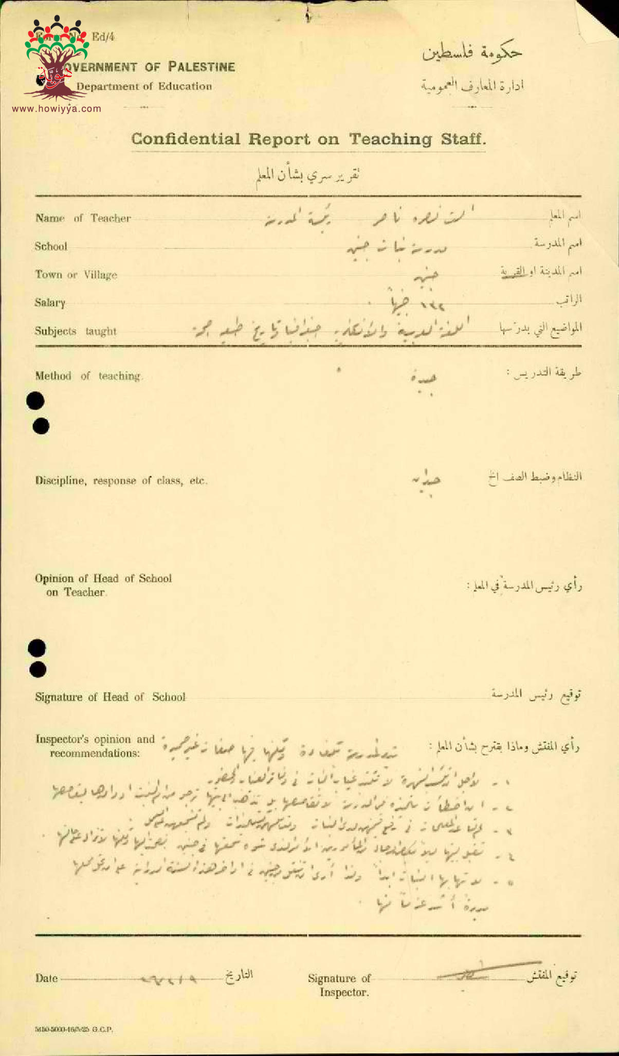تقرير تفصيلي عن أداء المعلمة نصرة ناصر في مدرسة جنين للإناث سنة 1926