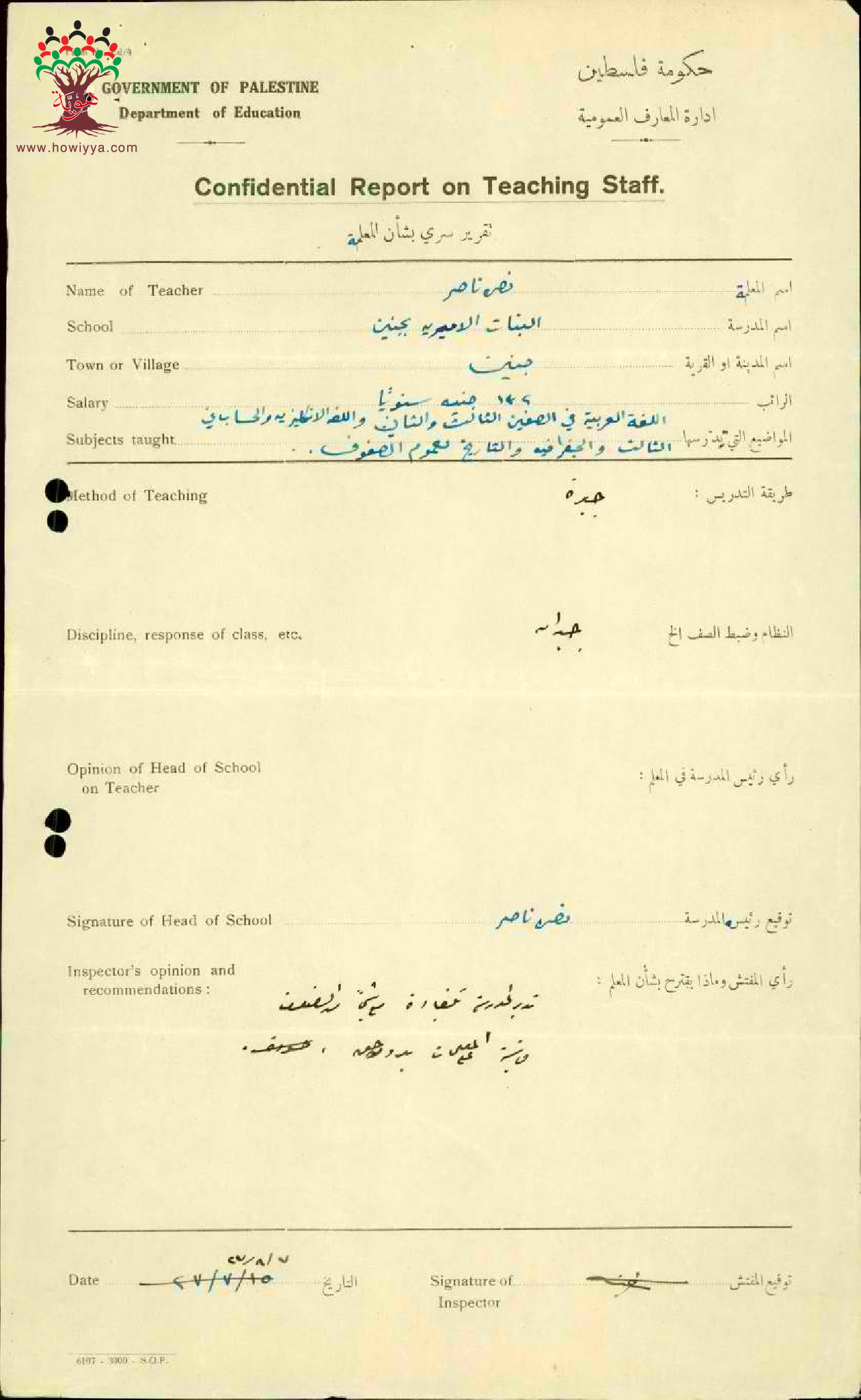 تقرير تفصيلي عن أداء المعلمة نصرة ناصر في مدرسة جنين للإناث سنة 1927