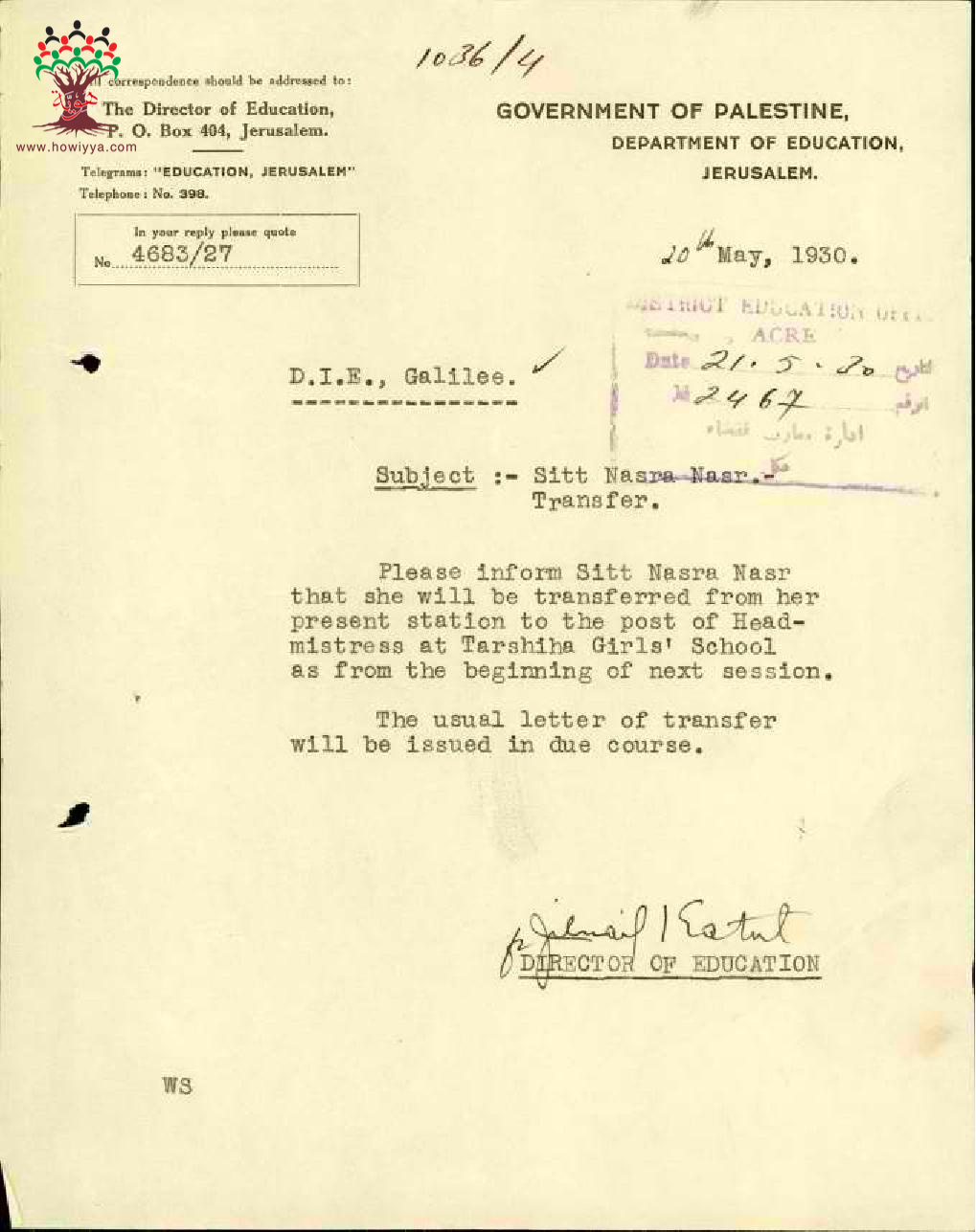 رسالة من مدير المعارف الى مفتش المعارف بخصوص نقل المعلمة نصرة ناصر من مدرسة الرامة الى مدرسة ترشيحا