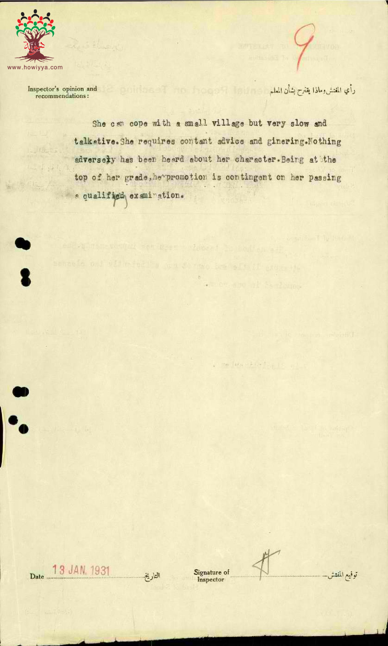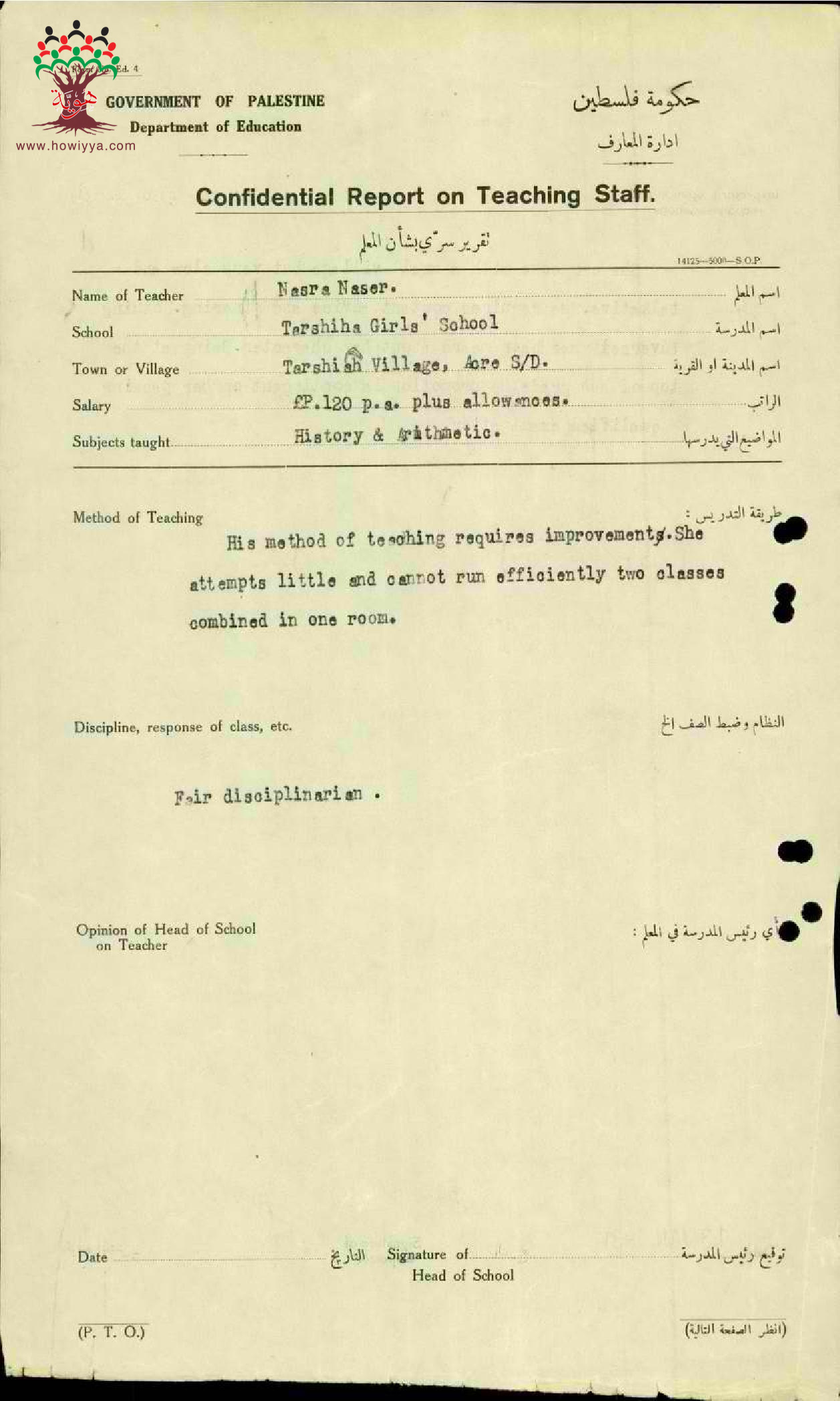 تقرير تفصيلي عن أداء المعلمة نصرة ناصر في مدرسة ترشيحا للإناث سنة 1930