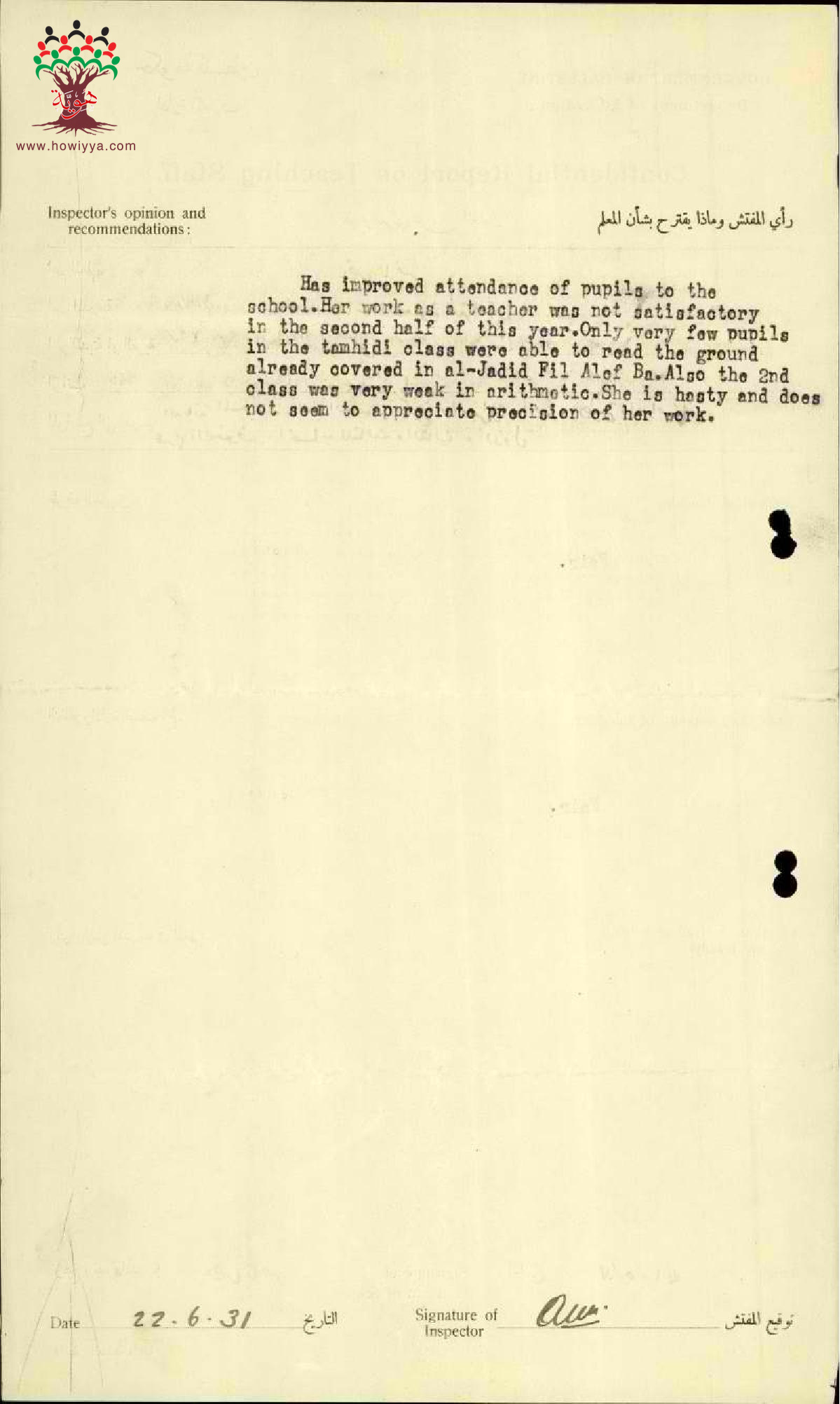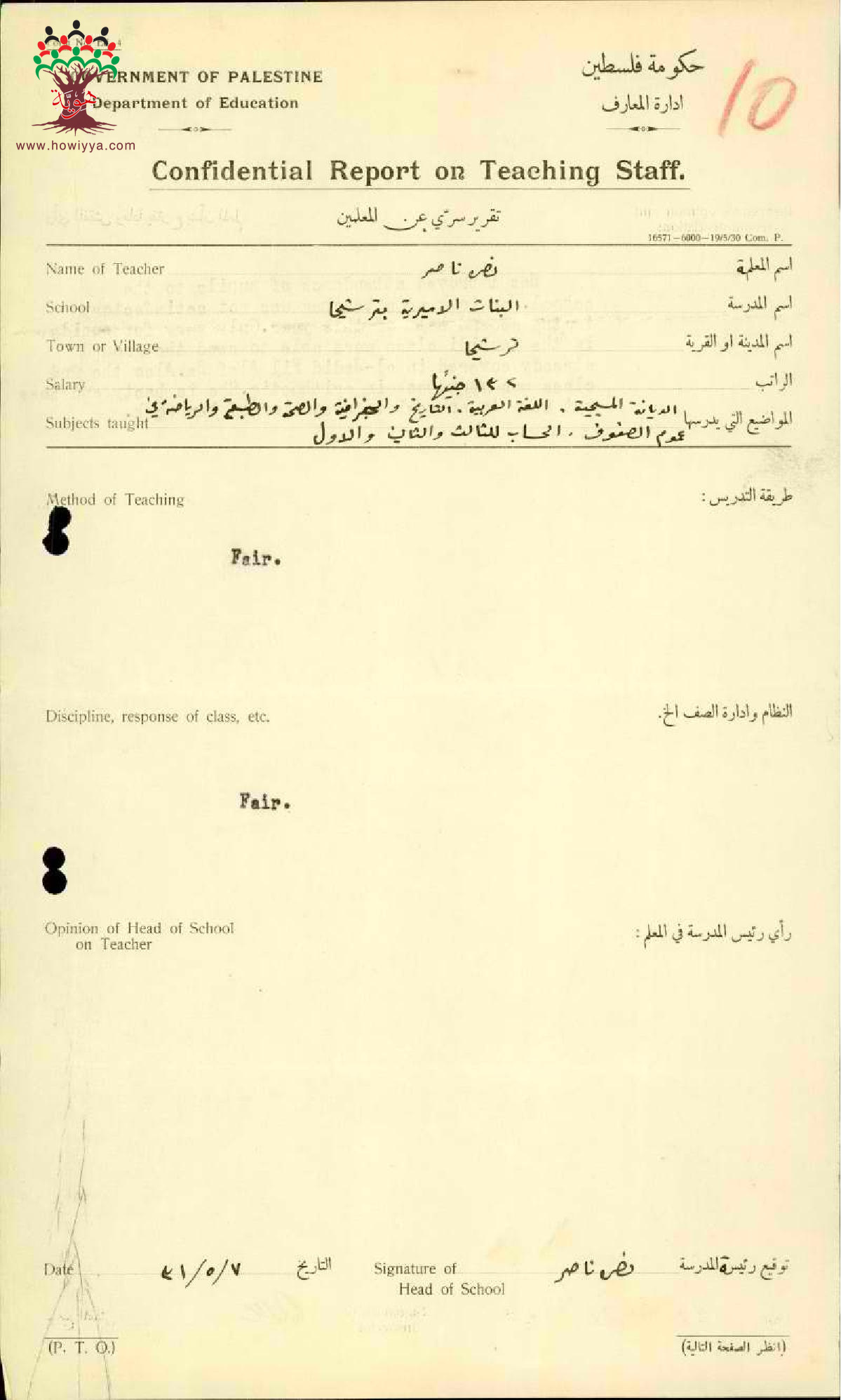 تقرير تفصيلي عن أداء المعلمة نصرة ناصر في مدرسة ترشيحا للإناث سنة 1931