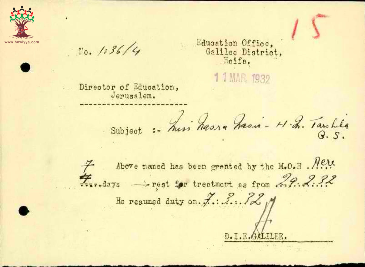 رسالة من مفتش المعارف الى مدير المعارف بخصوص اجازة مرضية للمعلمة نصرة ناصر وعودتها للعمل