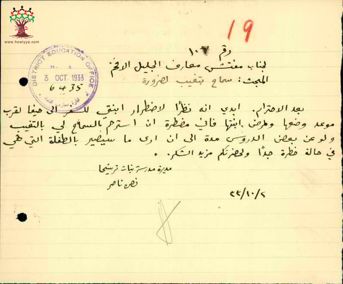 رسالة من المعلمة نصرة ناصر الى مفتش المعارف تطلب الإذن بالتغيب للضرورة