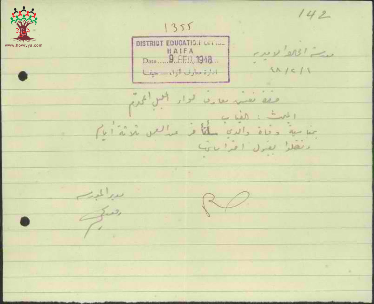 رسالة من المعلم رفعت غنيم الى مفتش المعارف يخبره أن سبب غيابه هو وفاة والده