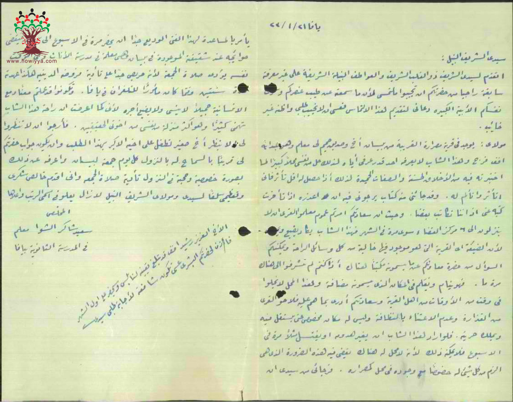 رسالة من المعلم سعيد الشوا/مدرسة يافا الى مفتش المععارف بخصوص سكن المعلم عبد الله فرج وامكانية نقله