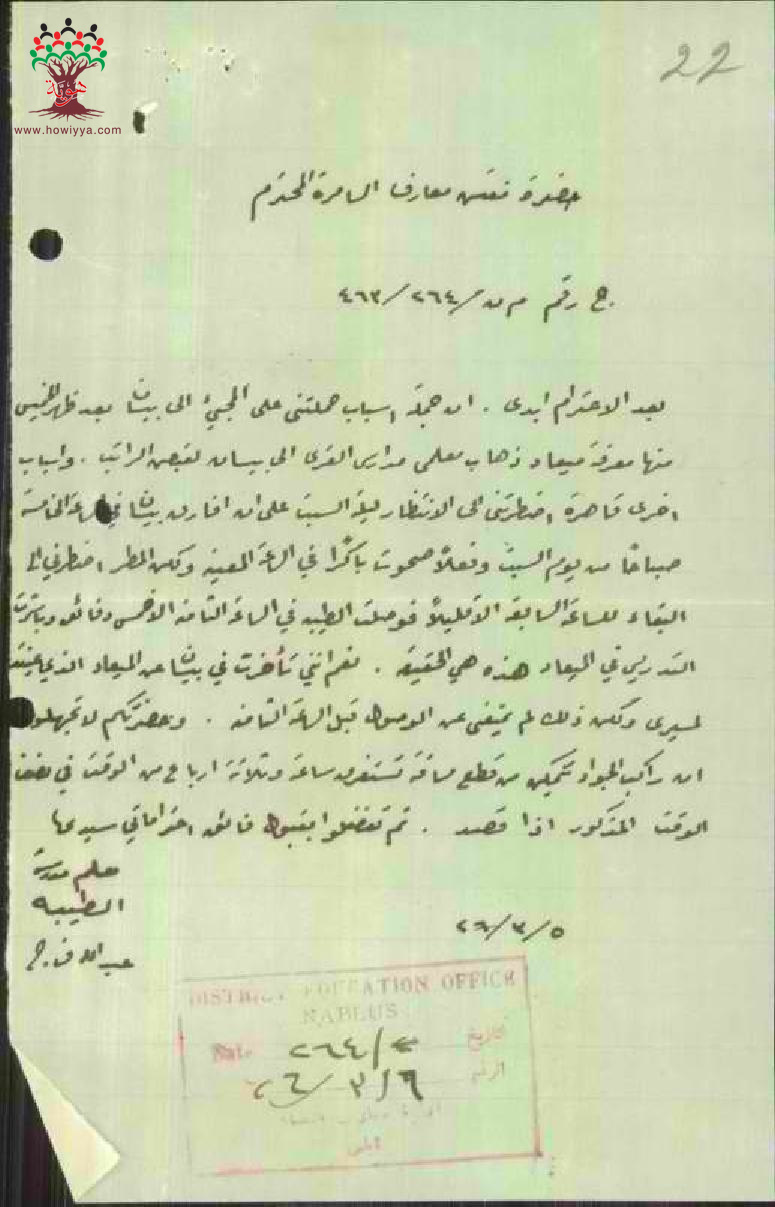 رسالة من المعلم عبد الله فرج الى مفتش المعارف بخصوص أسباب تغيبه