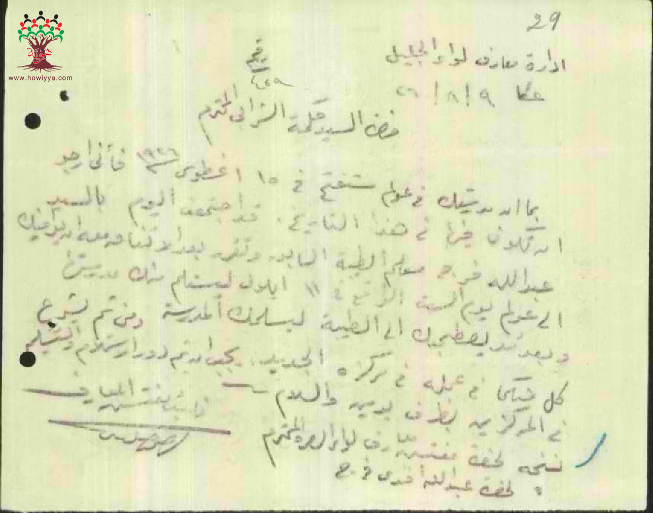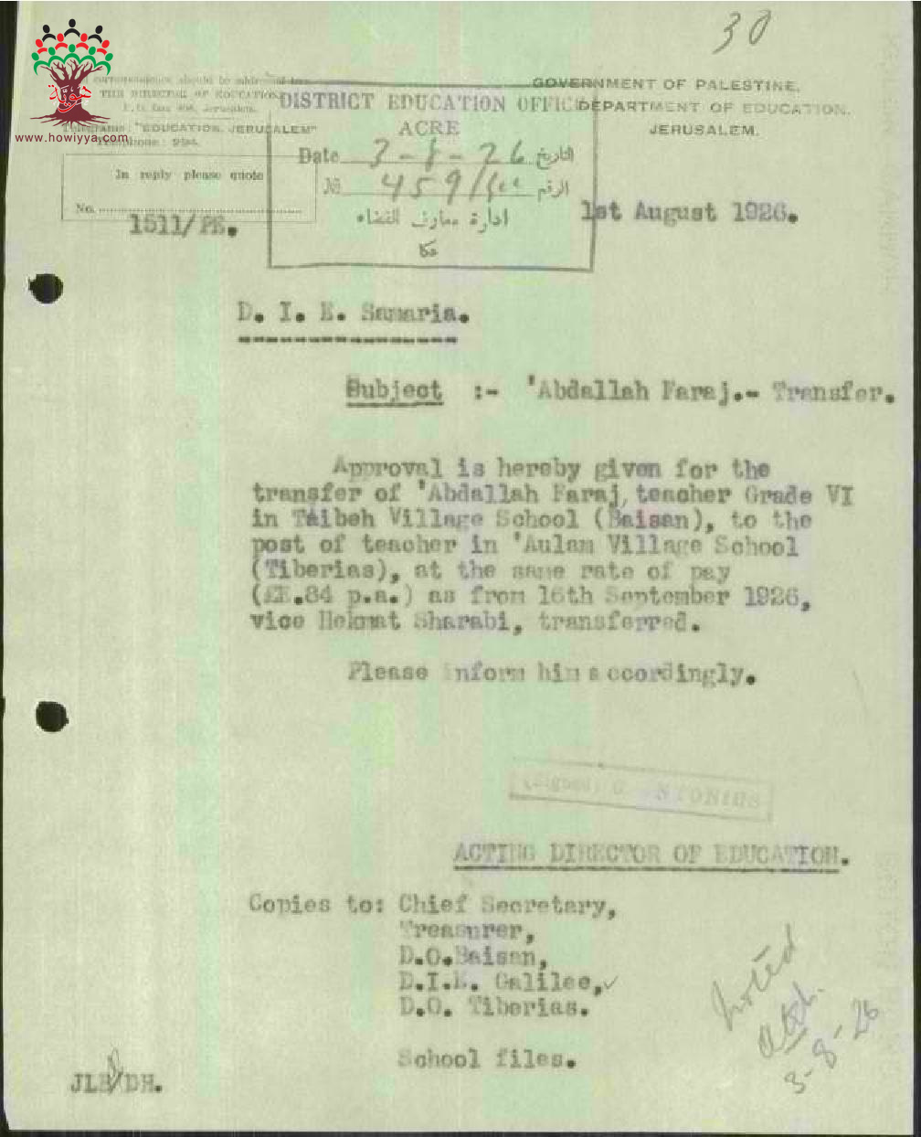 مجموعة رسائل بخصوص نقل المعلم عبد الله فرج من مدرسة طيبة الى مدرسة عولم