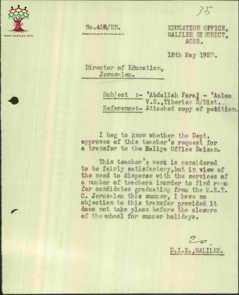 رسالة من مفتش المعارف الى مدير المعارف بخصوص امكانية نقل المعلم عبد الله فرج الى دائرة المالية