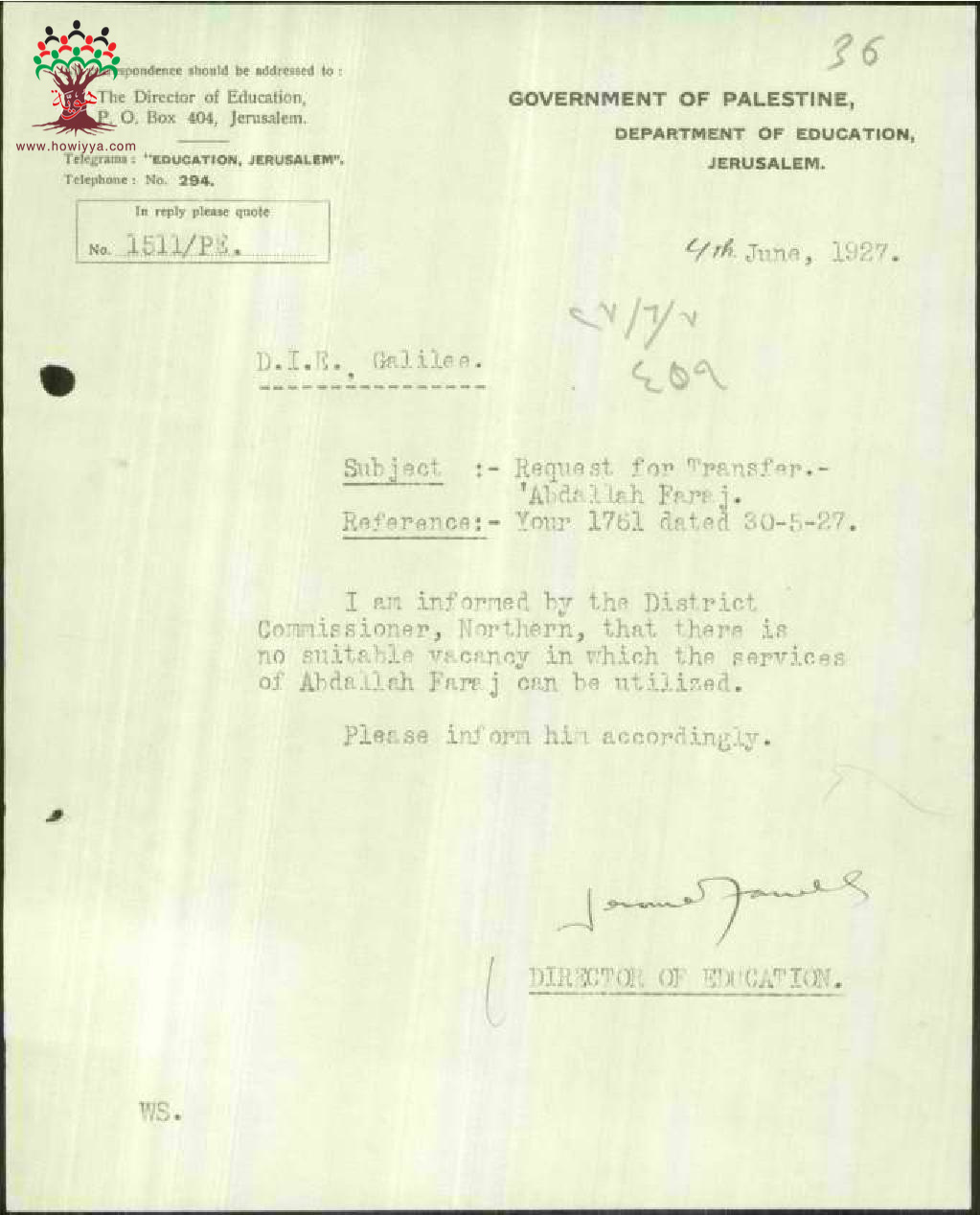 رسالة من مدير المعارف الى مفتش المعارف بخصوص عدم امكانية نقل المعلم عبد الله فرج الى دائرة المالية