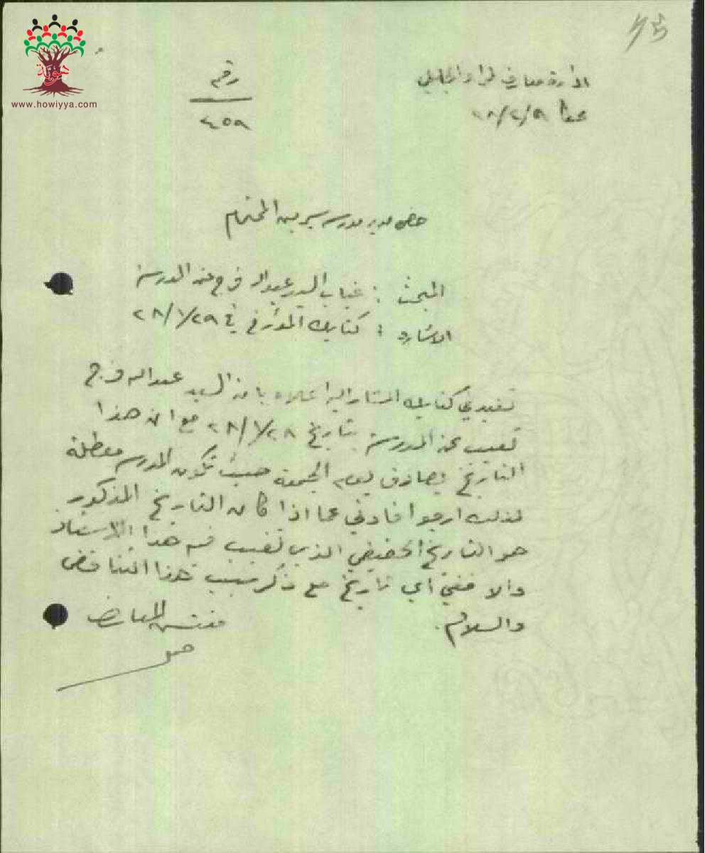 رسالة من مفتش المعارف الى مدير مدرسة سيرين/عولم بخصوص تاريخ تغيب المعلم عبد الله فرج