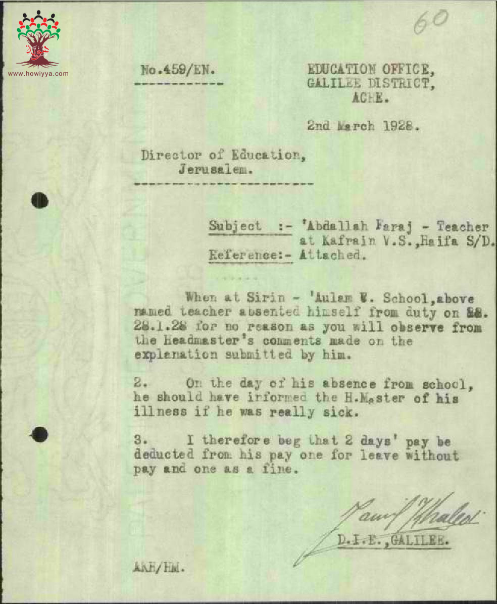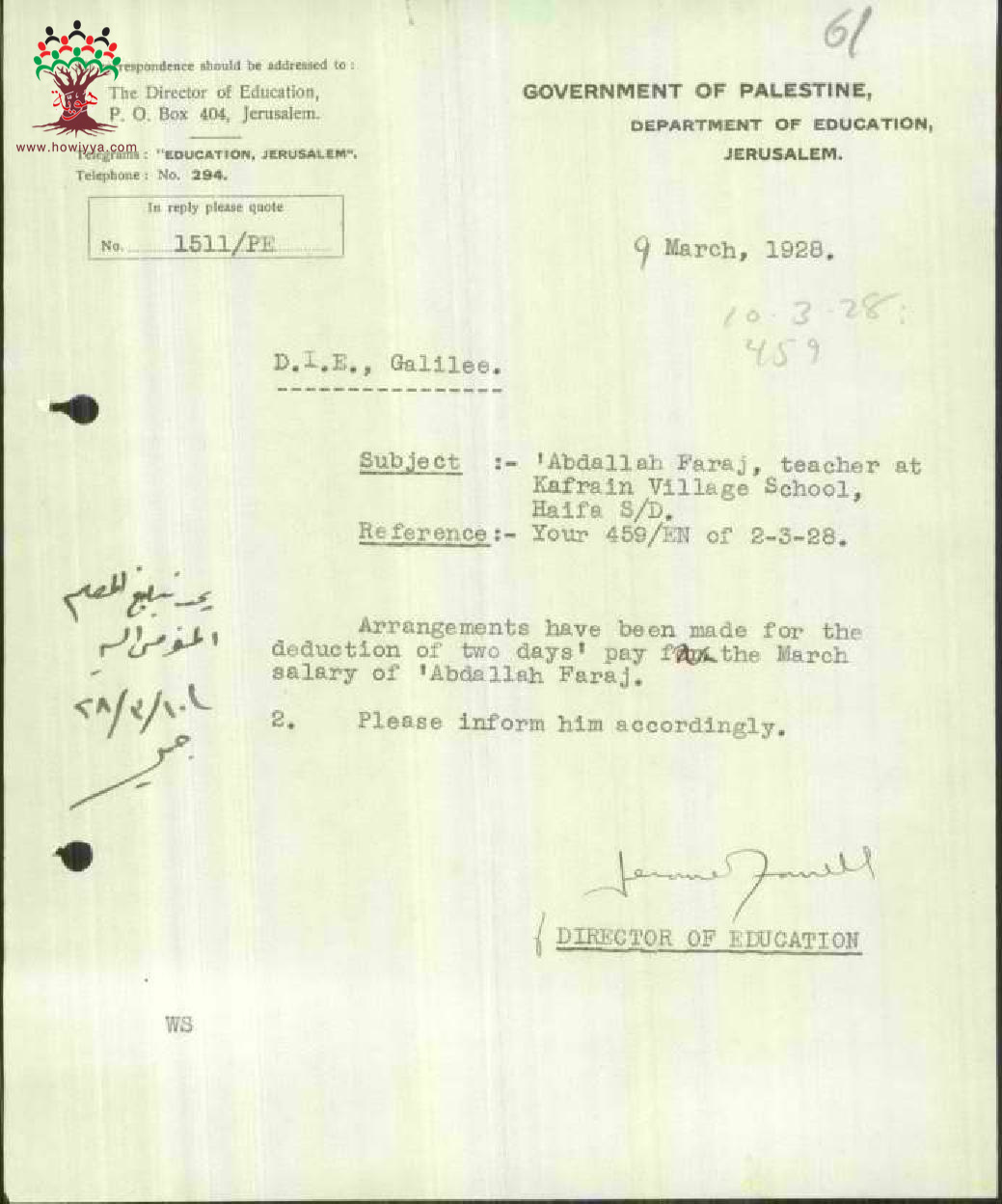 مجموعة رسائل بخصوص الخصم من راتب المعلم عبد الله فرج بسبب تغيبه دون تقرير طبي