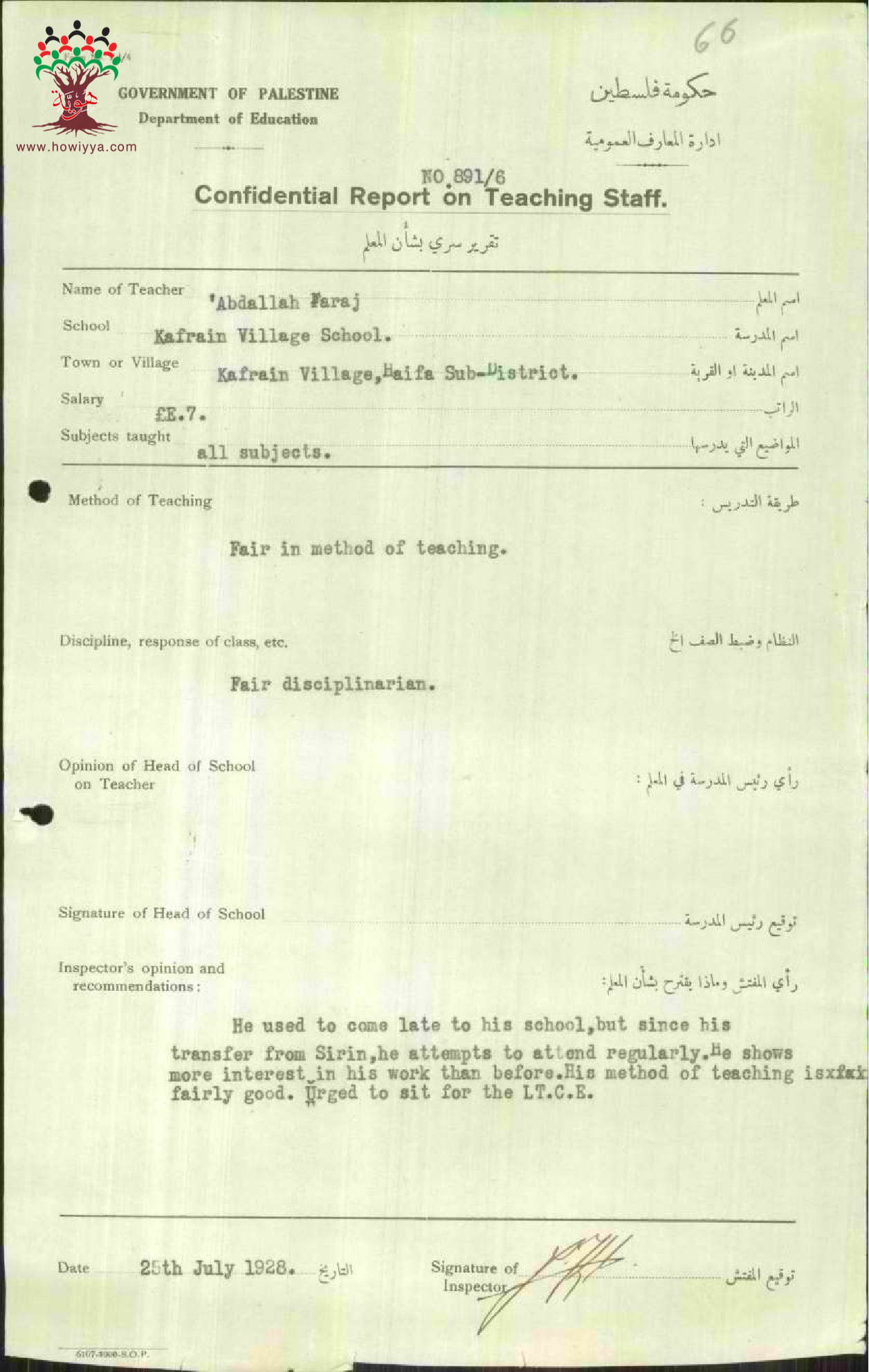 تقرير تفصيلي عن أداء المعلم عبد الله فرج في مدرسة الكفرين سنة 1928