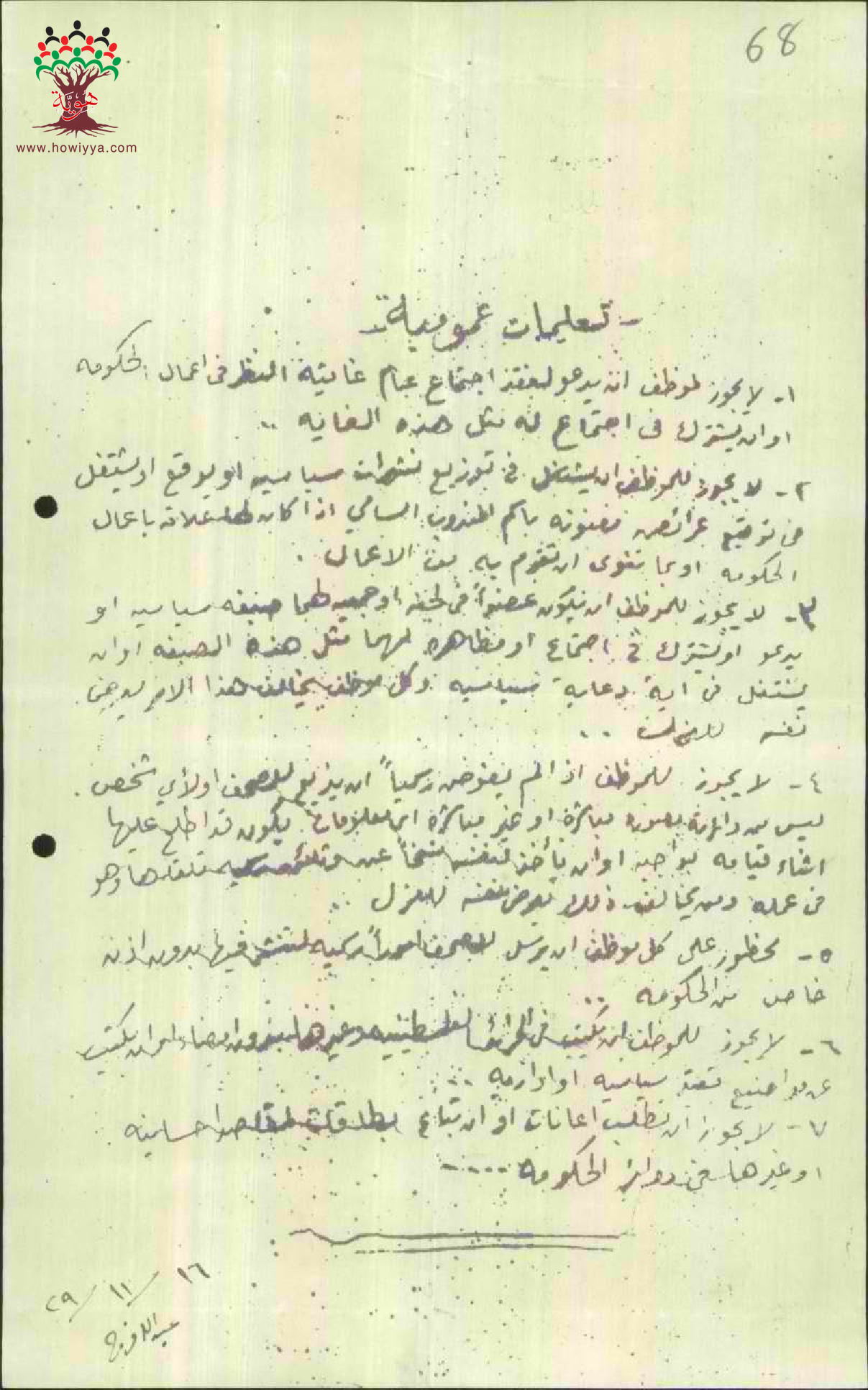توقيع المعلم عبد الله فرج على التعليمات العمومية لإدارة المعارف