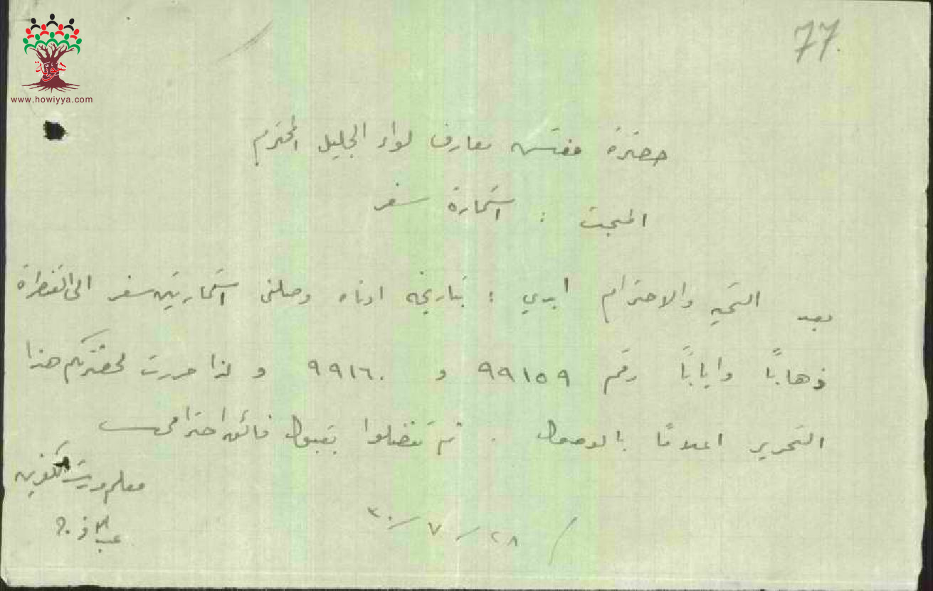 رسالة من المعلم عبد الله فرج الى مفتش المعارف يخبره بأنه قد تسلم استمارة سفره
