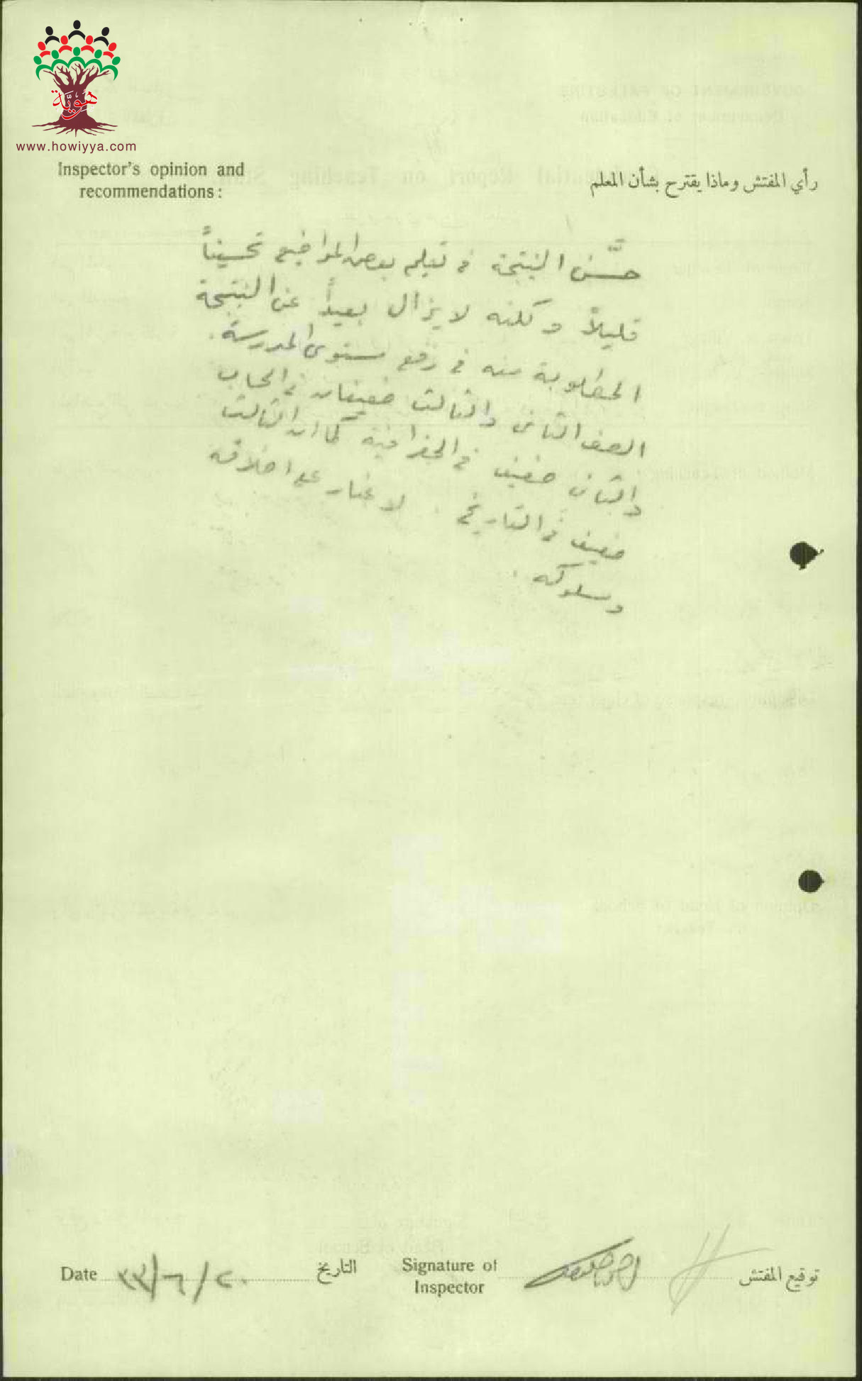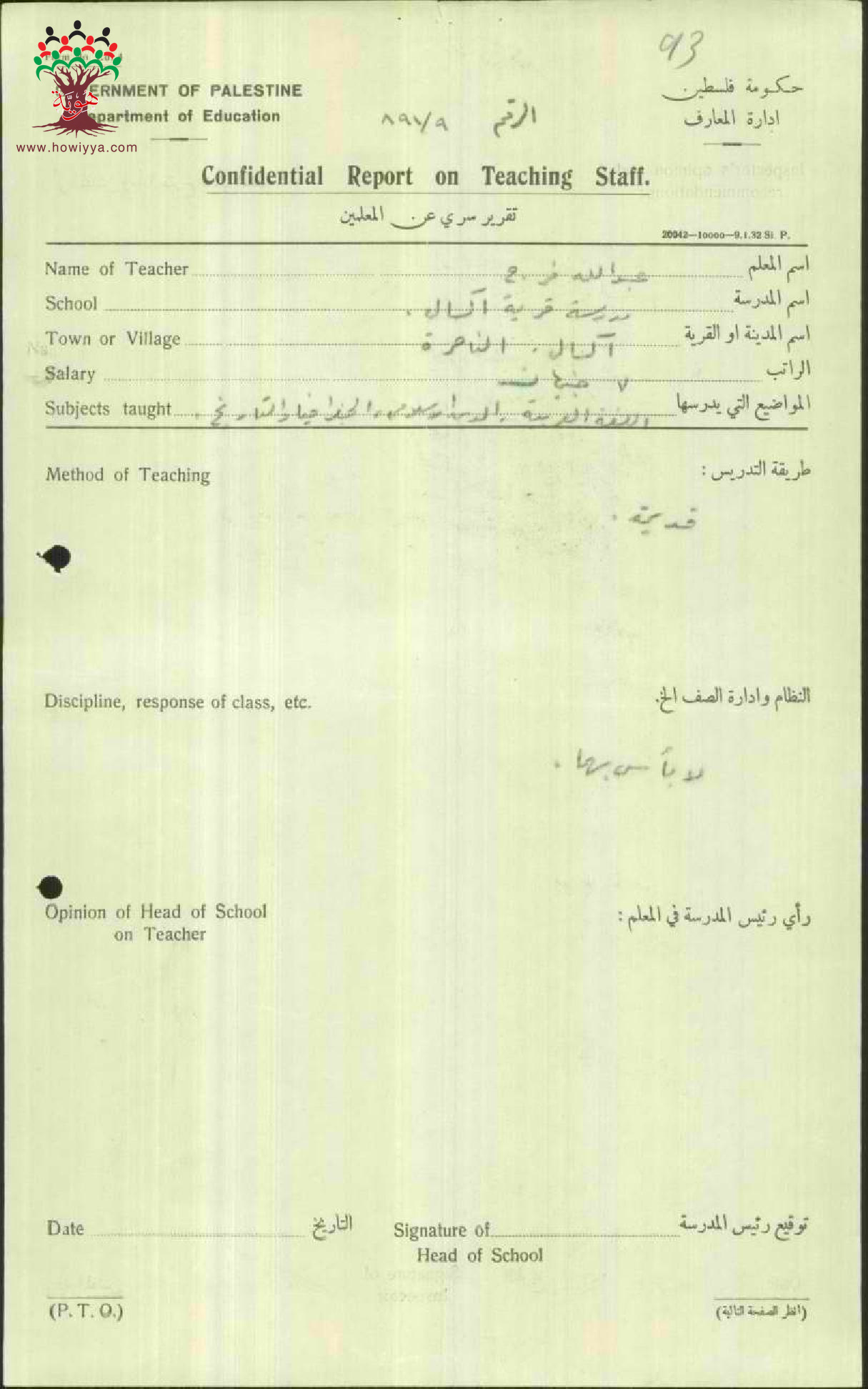 تقرير تفصيلي عن أداء المعلم عبد الله فرج في مدرسة اكسال سنة 1933