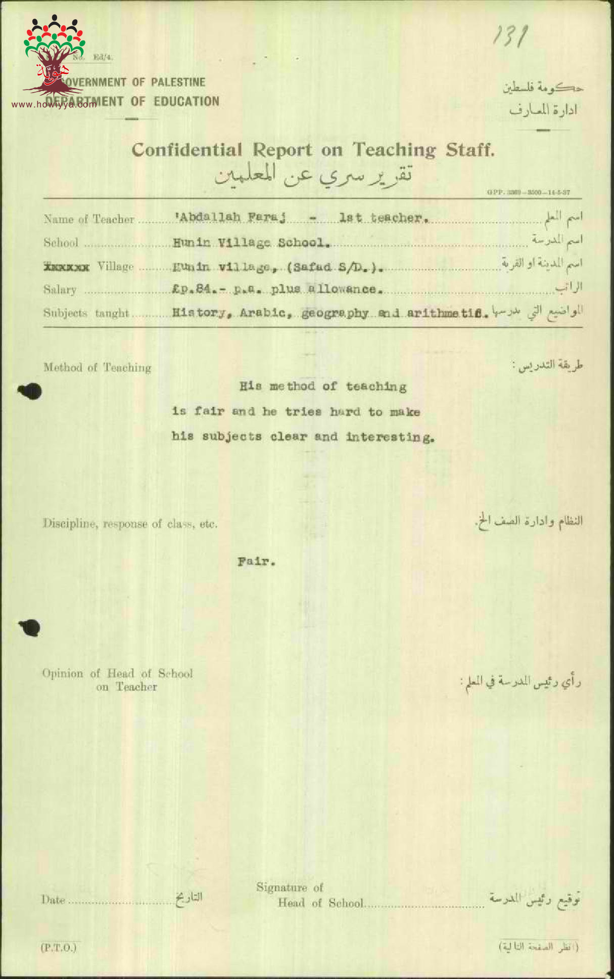 تقرير تفصيلي عن أداء المعلم عبد الله فرج في مدرسة هونين سنة 1937