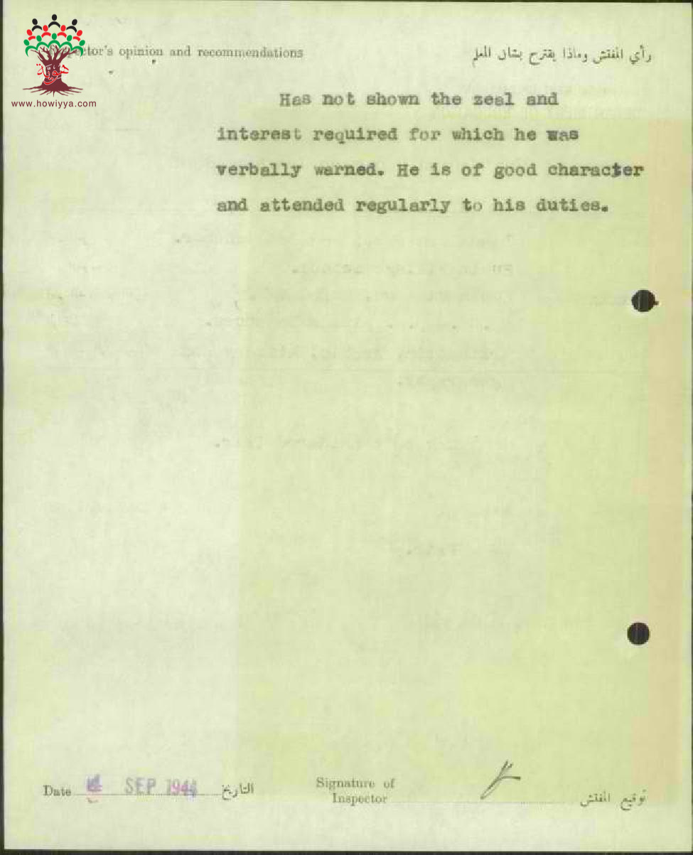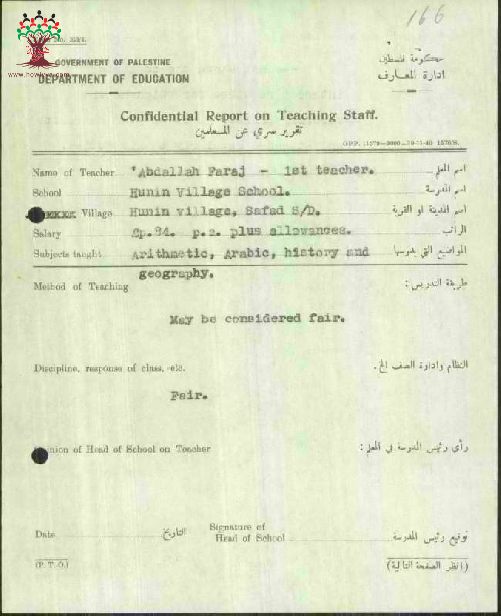تقرير تفصيلي عن أداء المعلم عبد الله فرج في مدرسة هونين سنة 1944
