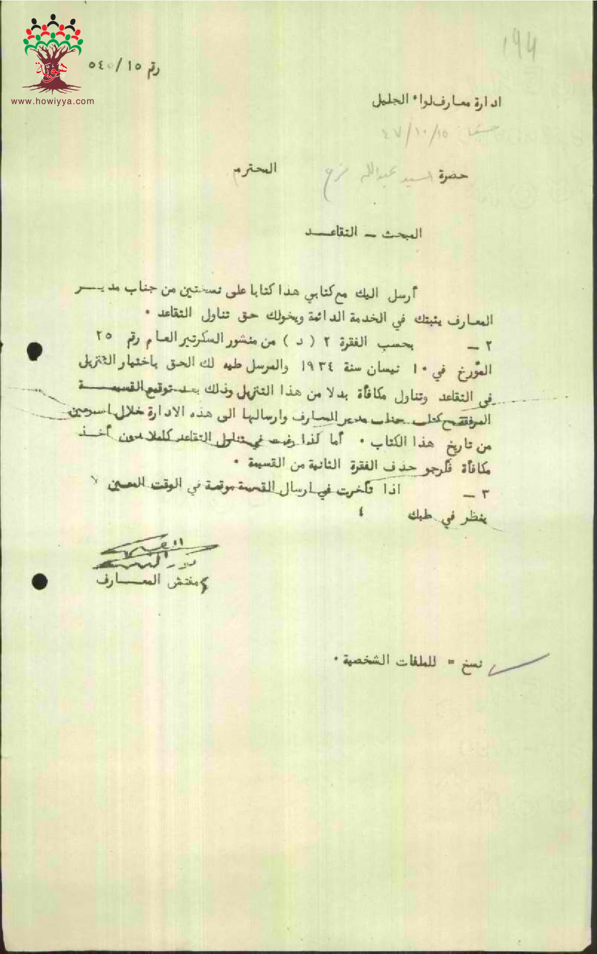 رسالة من مفتش المعارف الى المعلم عبد الله فرج بخصوص تثبيته في الخدمة وحقه في تناول التقاعد