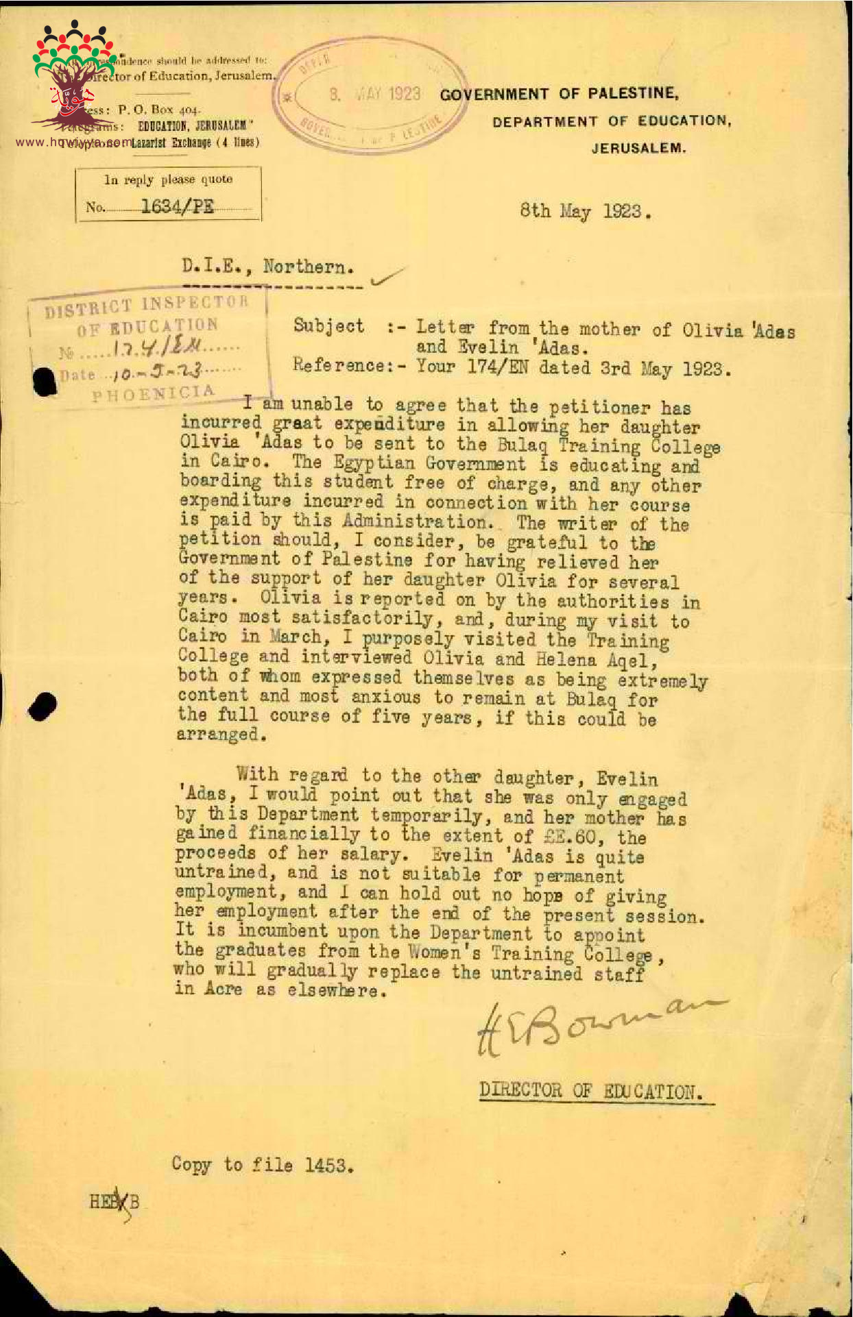 رسالة من مدير المعارف الى مفتش المعارف رداً على الاسترحام المقدم من والدة المعلمة افلين عدس