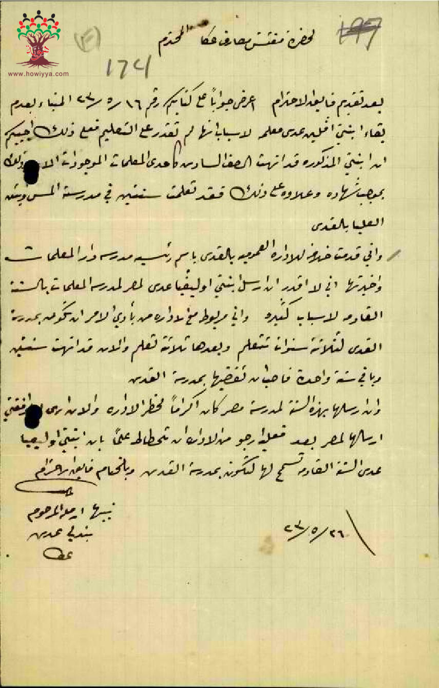 رسالة من والدة المعلمة افلين عدس الى مفتش المعارف بخصوص وضع بناتها في ادارة المعارف