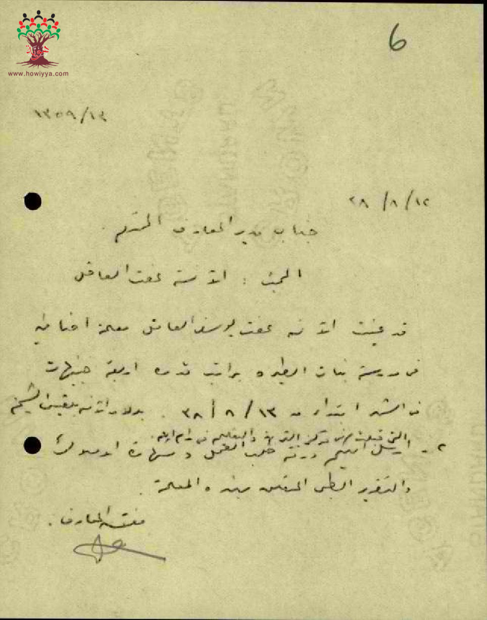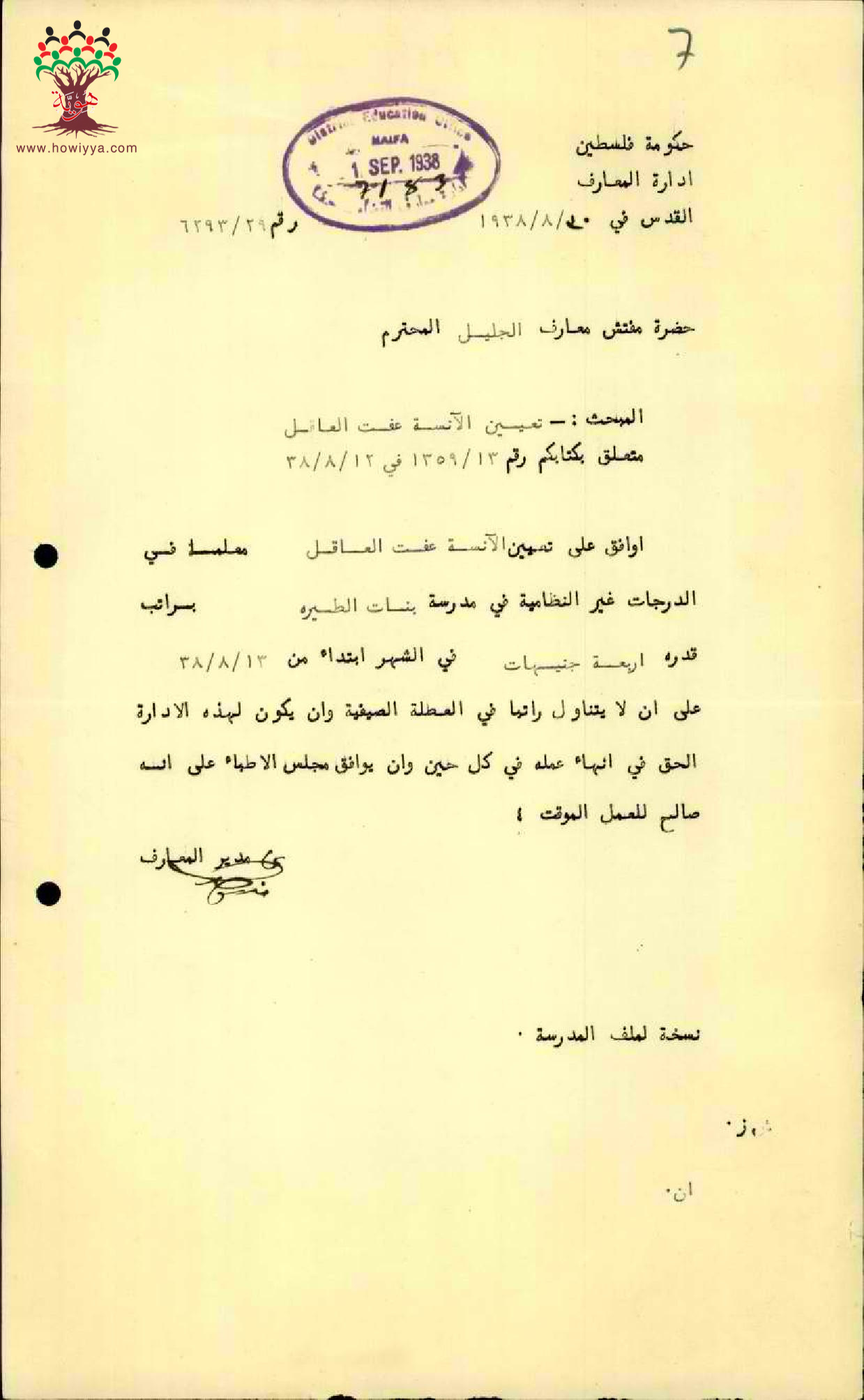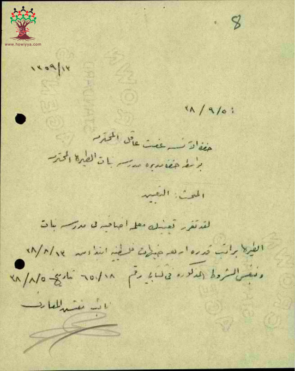 مجموعة رسائل بخصوص تعيين المعلمة عفت العاقل في مدرسة الطيرة