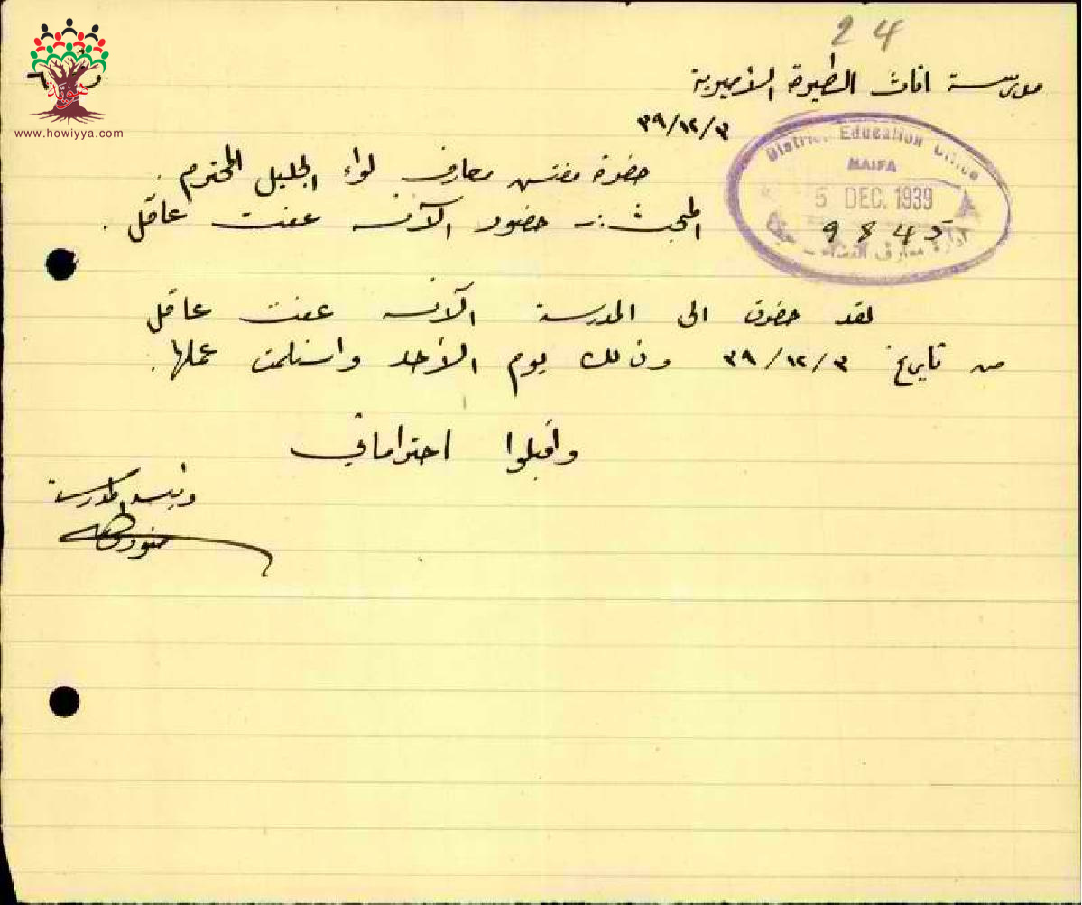رسالة من مديرة مدرسة الطيرة الى مفتش المعارف تخبره بعودة المعلمة عفت عاقل الى العمل