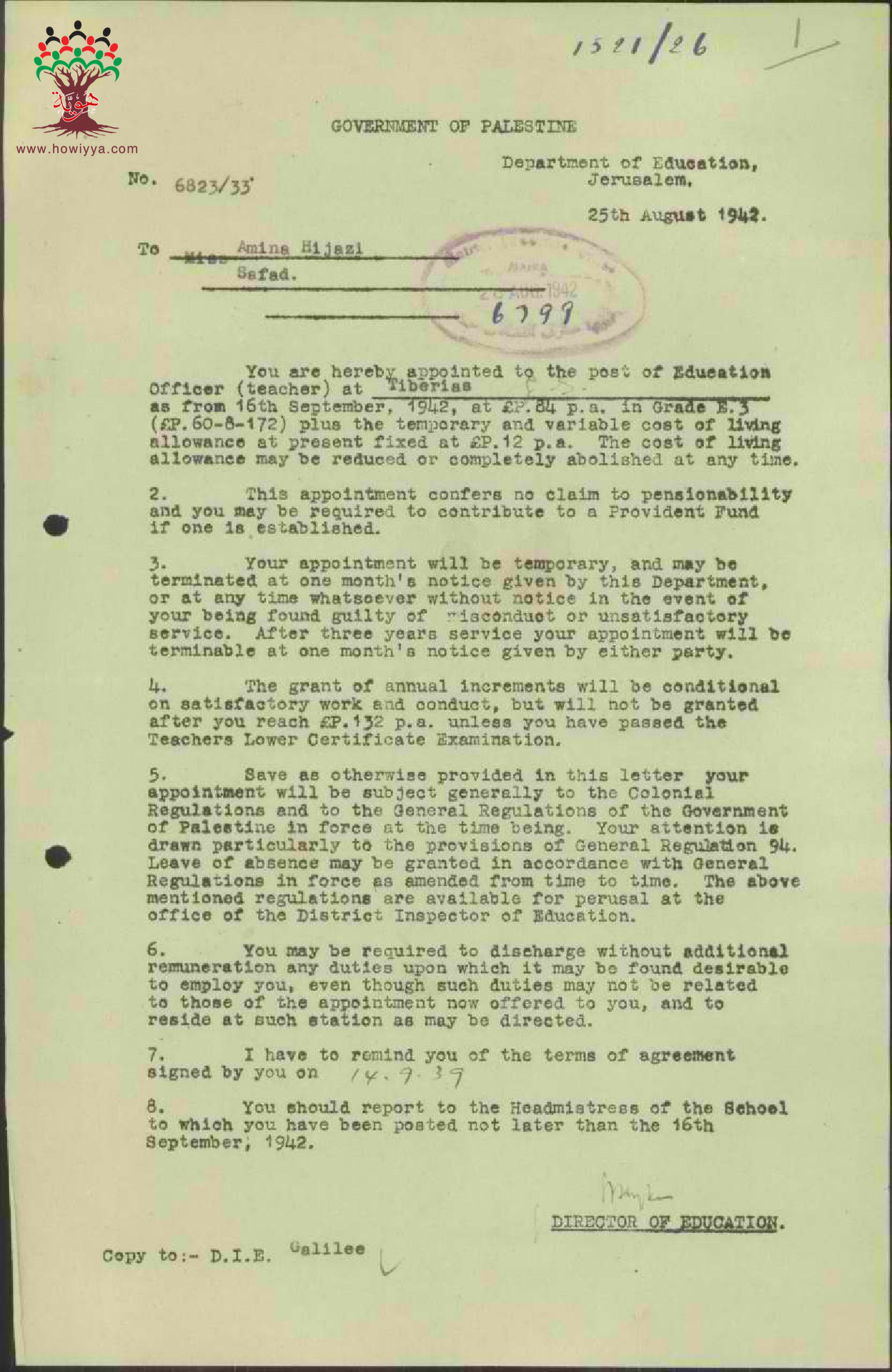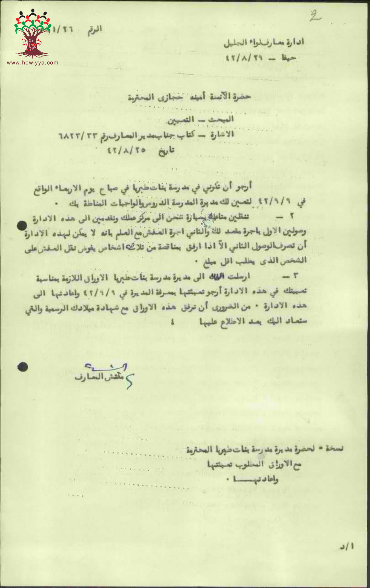 رسائل بخصوص تعيين المعلمة أمينة حجازي في مدرسة بنات طبريا