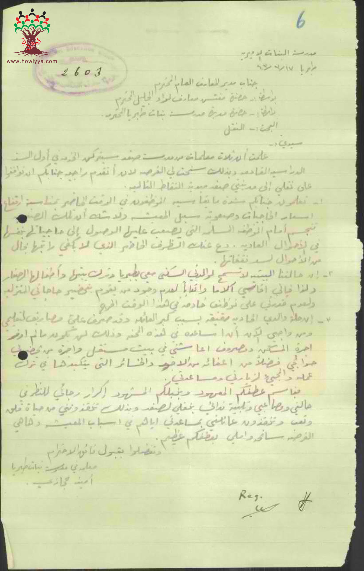 رسالة من المعلمة أمينة حجازي الى مفتش المعارف تطلب فيها نقلها من مدرسة طبريا الى مدرسة صفد