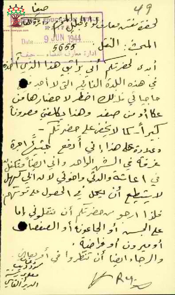 رسالة من المعلم محمود دغمان الى مفتش المعارف يطلب فيها نقله من مدرسة دير القاسي
