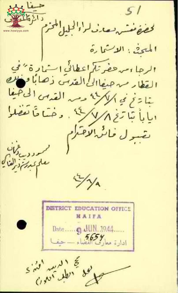 رسالة من المعلم محمود دغمان الى مفتش المعارف يطلب فيها استمارة سفره السنوية